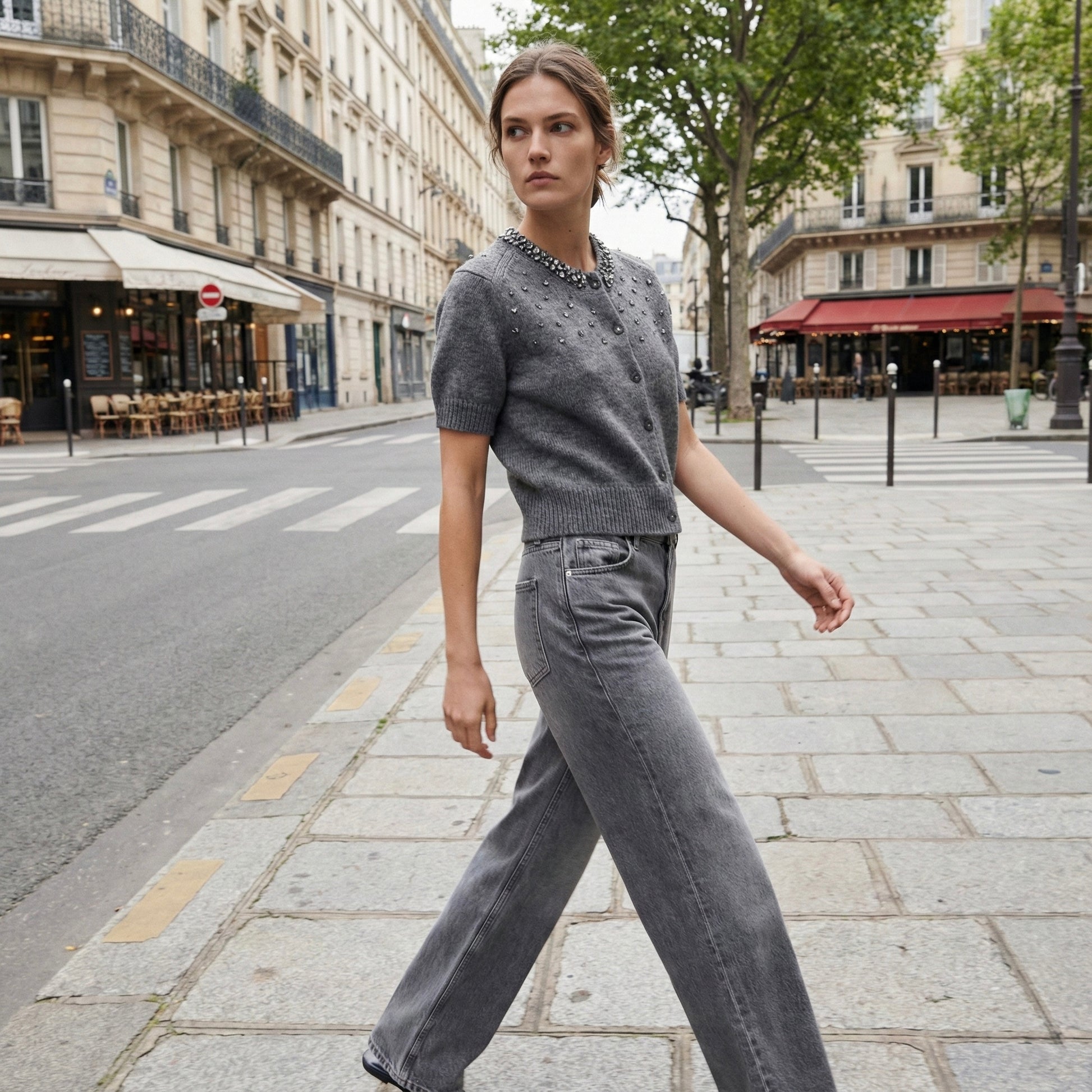 Cardigan en maille à manches courtes, col rond orné d’éléments décoratifs appliqués. Fermeture boutonnée discrète, coupe ajustée, finitions côtelées aux manches et à la base