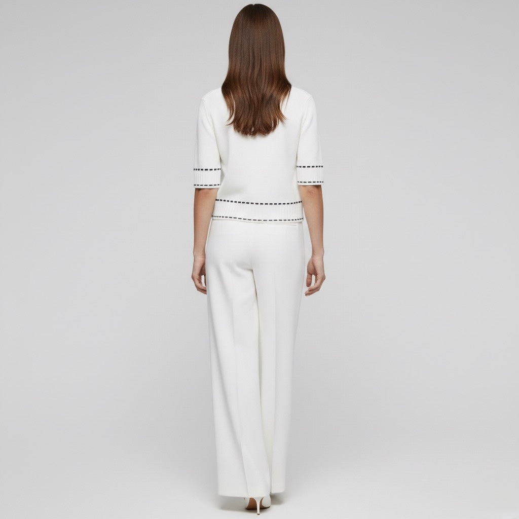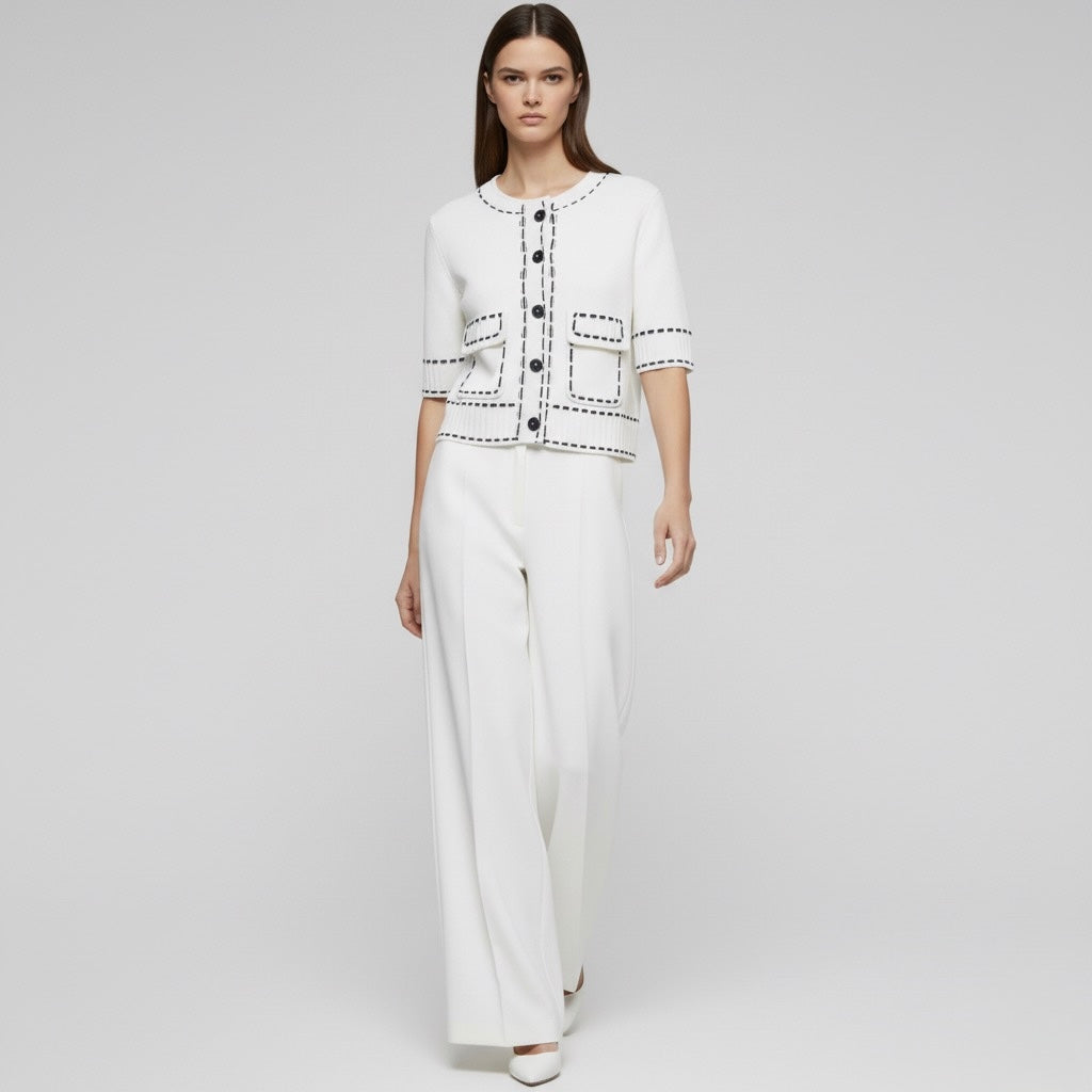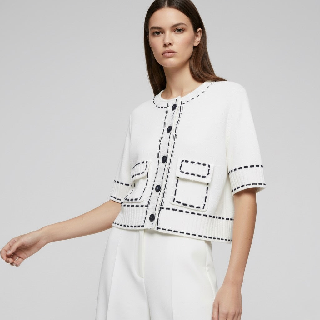 Gilet court sans manches, col rond, fermeture frontale par boutons facettés, ligne légèrement évasée sur le bas.