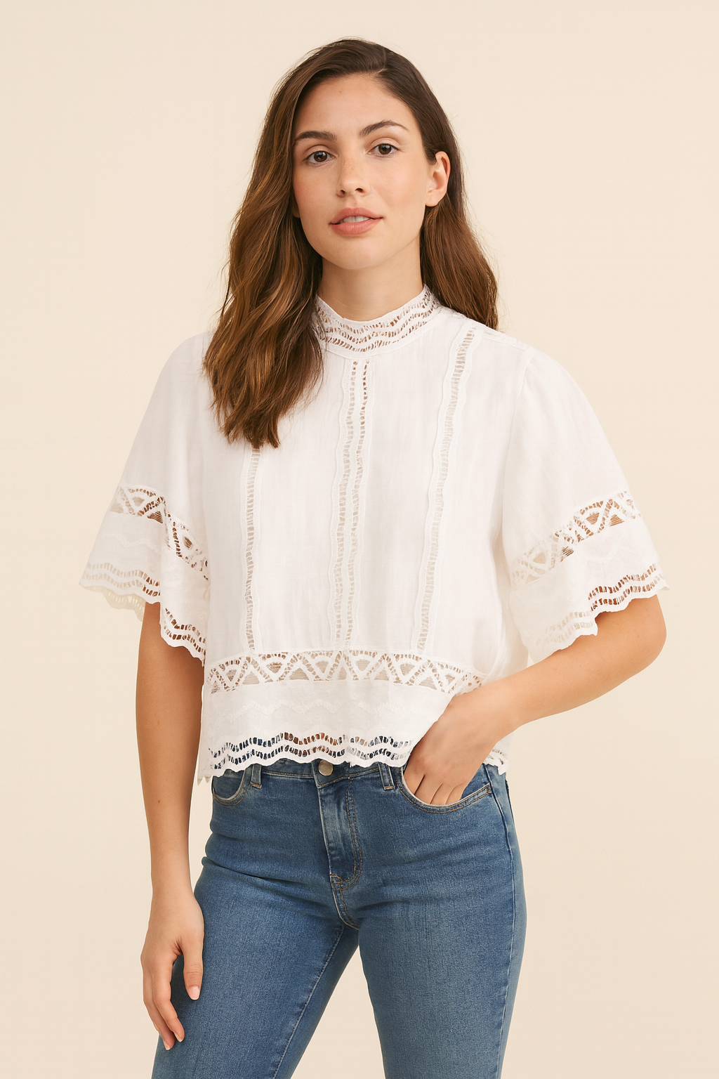 Blouse courte en coton léger. Détail de bandes en dentelle ajourée devant, manches et ourlet. Col montant structuré avec fermeture goutte boutonnée à l’arrière.
