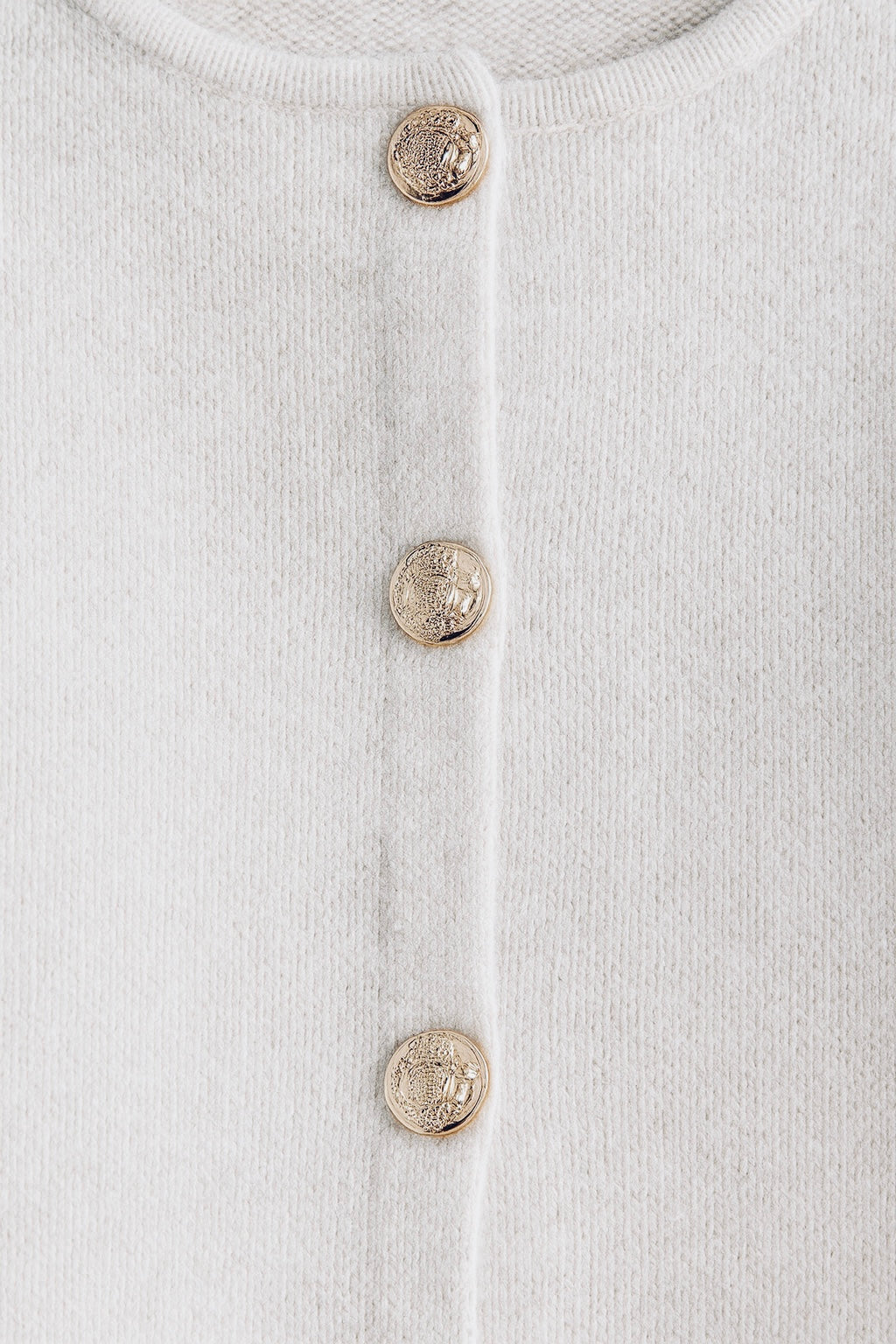 Gilet sans manches à coupe droite, épaules légèrement marquées, en maille texturée. Fermeture frontale par boutons métallisés gravés. Encolure ronde et finitions nettes pour une silhouette minimaliste.