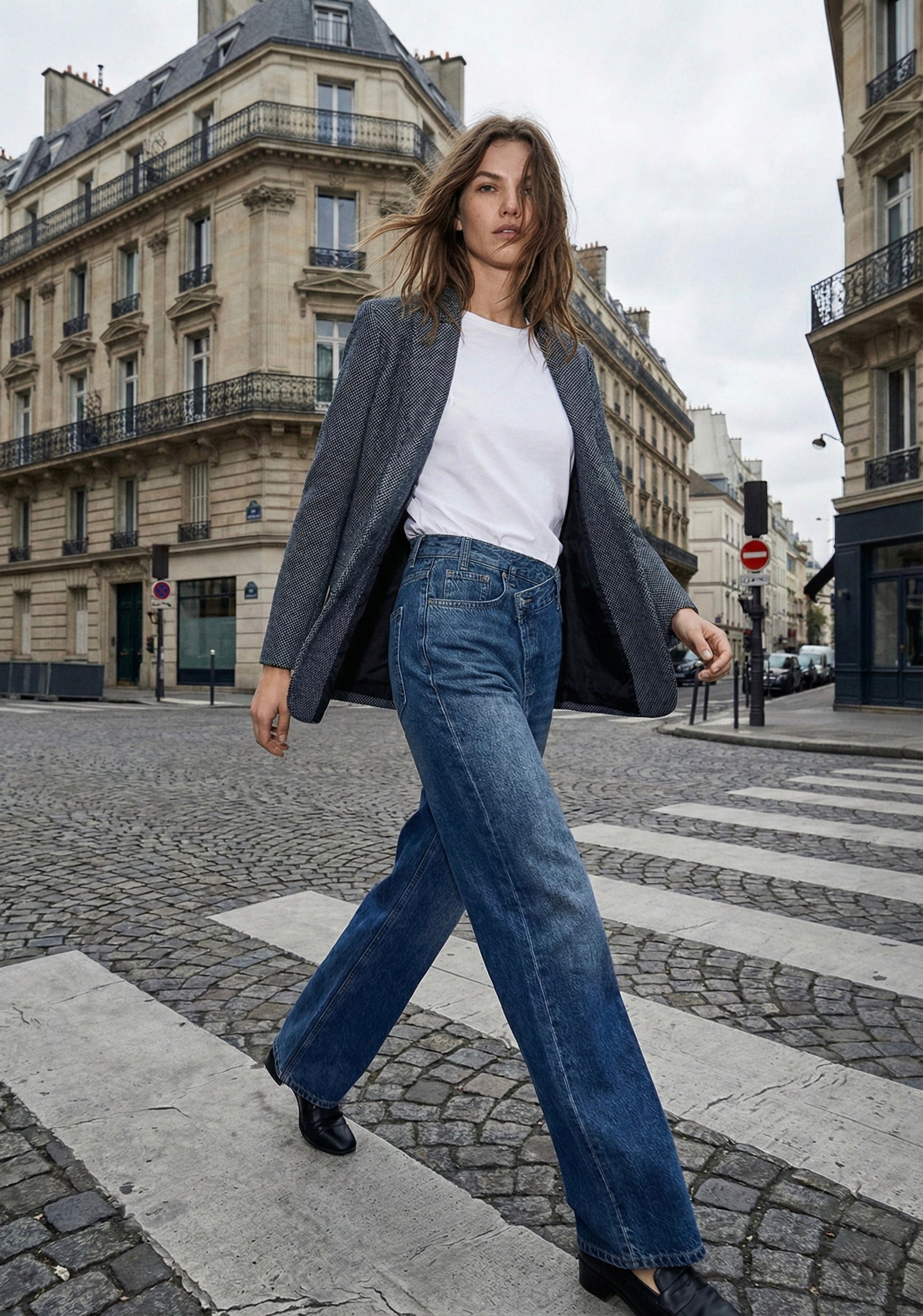 Coupe large à taille mi-haute, poches plaquées, surpiqûres contrastées et jambe fluide
