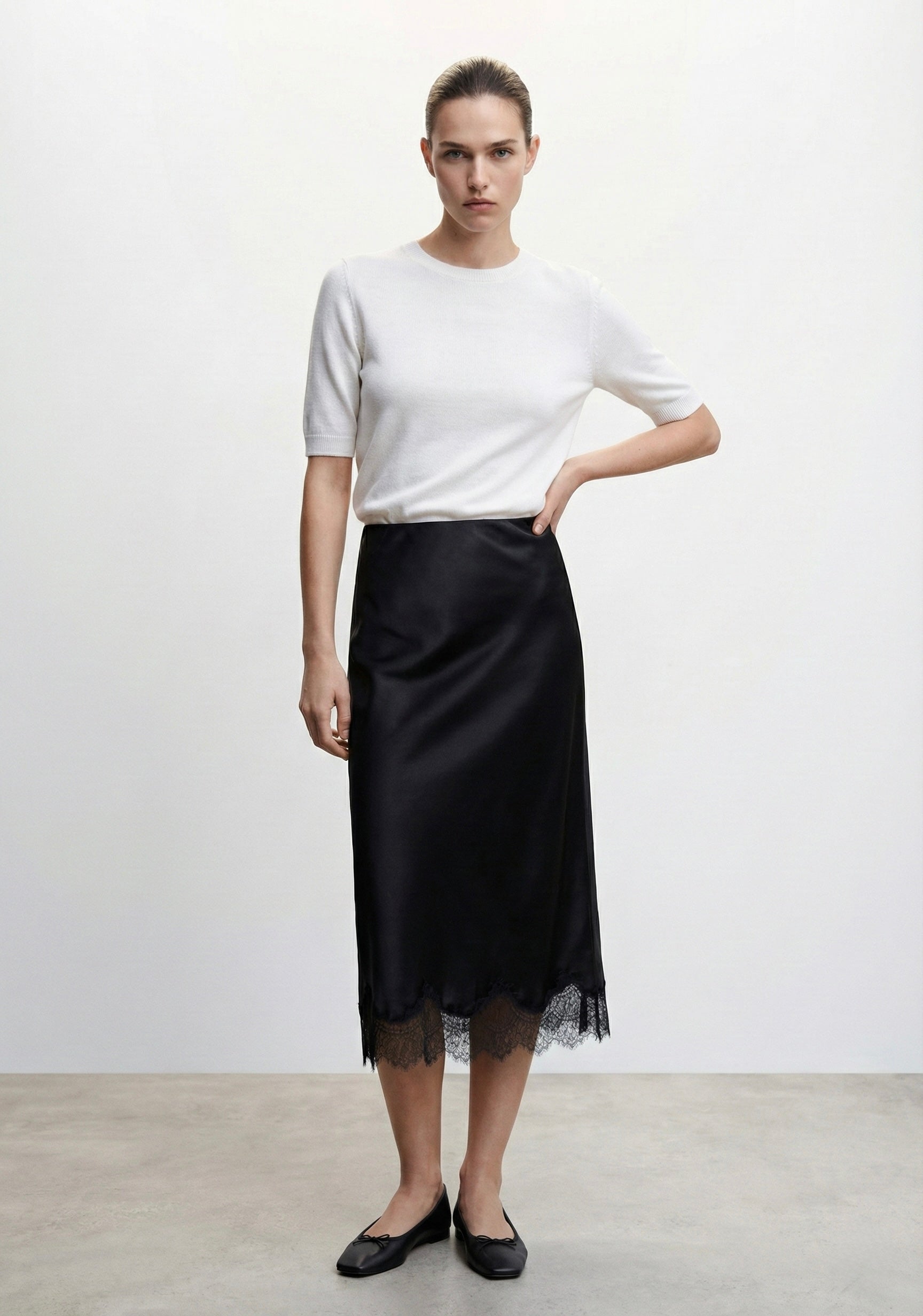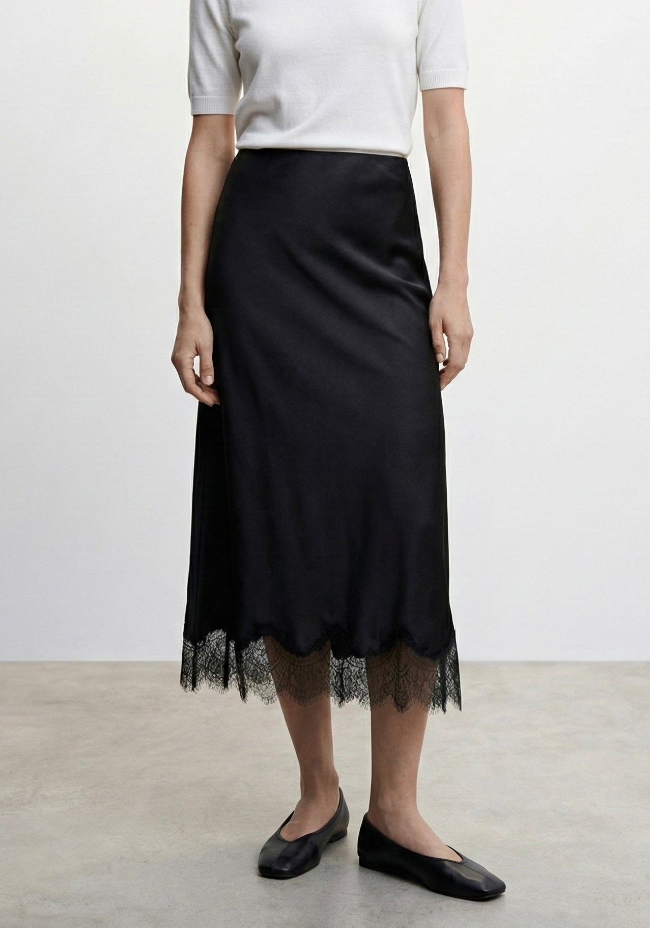 JUPE MIDI SATINÉE À FINITION DENTELLE
