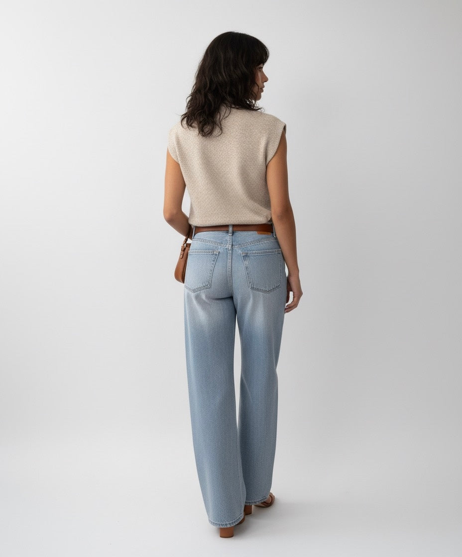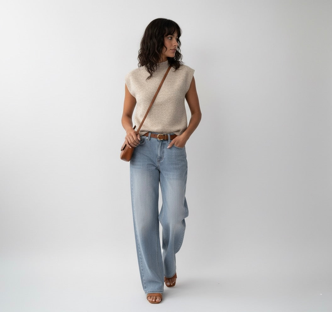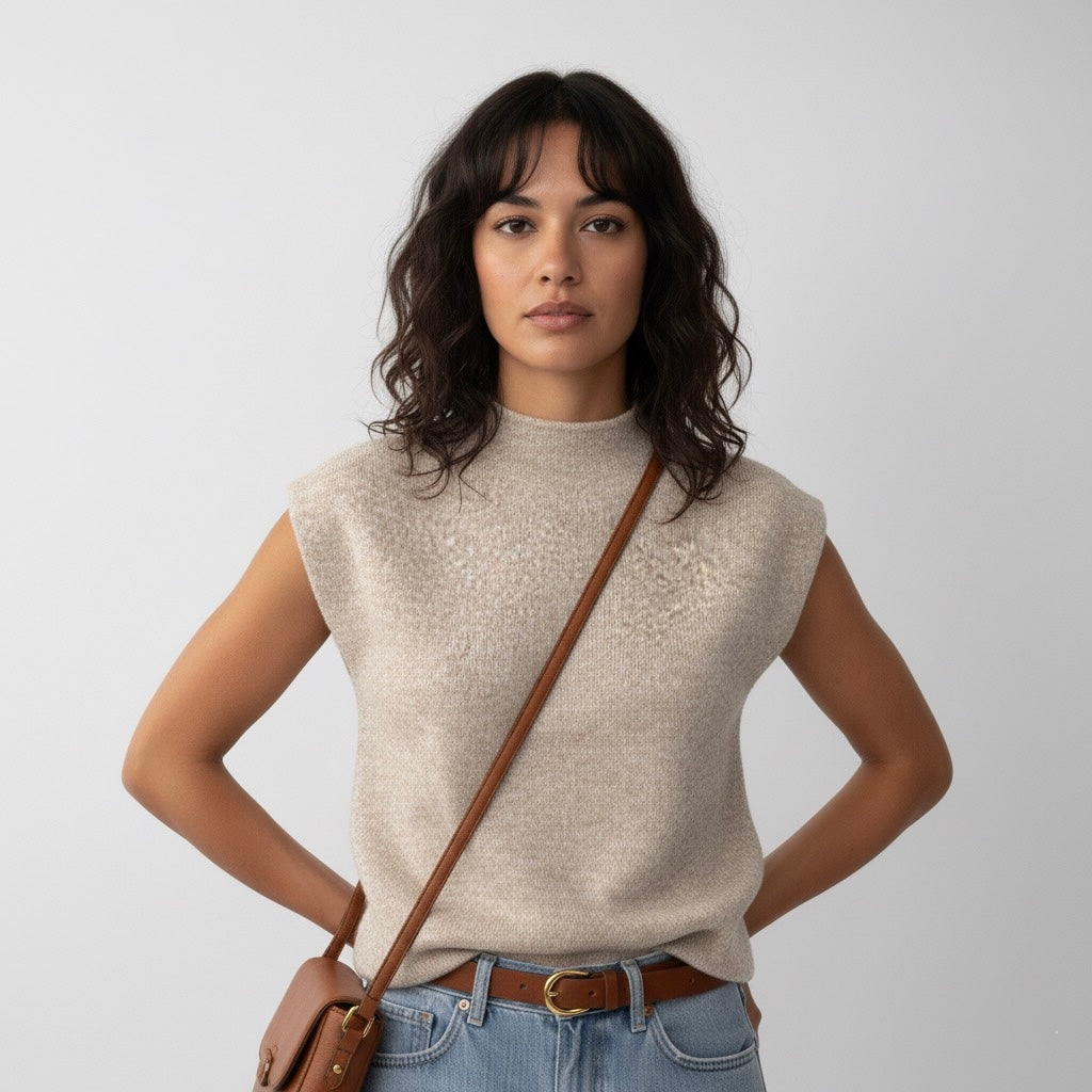 Top en maille fine, coupe droite légèrement ajustée. Col montant structuré et emmanchures dégagées pour une silhouette épurée. Finition lisse et toucher doux.