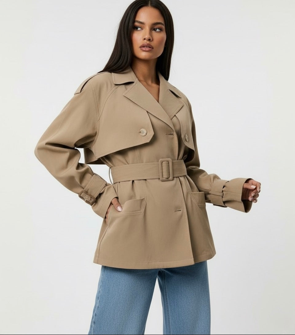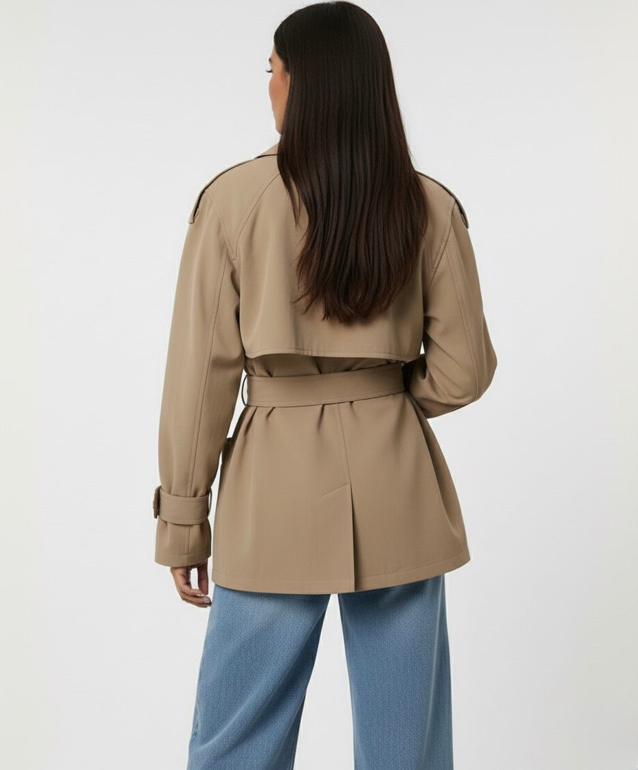 Trench court à double boutonnage, empiècement épaules et large ceinture ton sur ton. Détails boutonnés aux poignets et grandes poches avant.