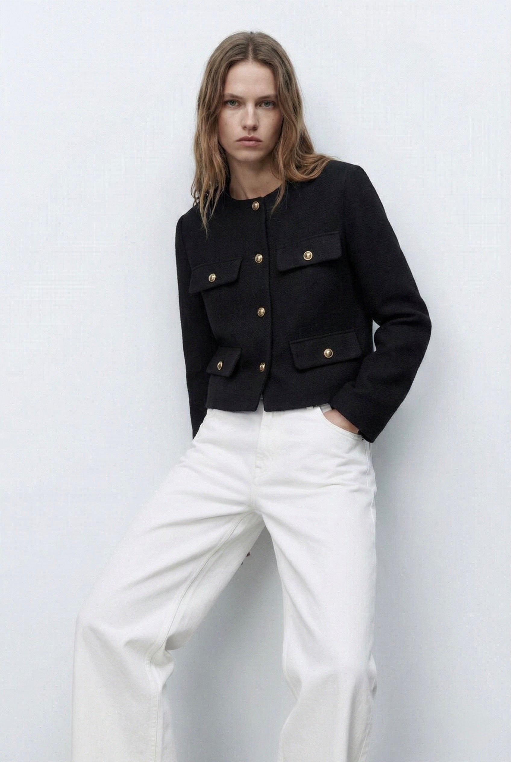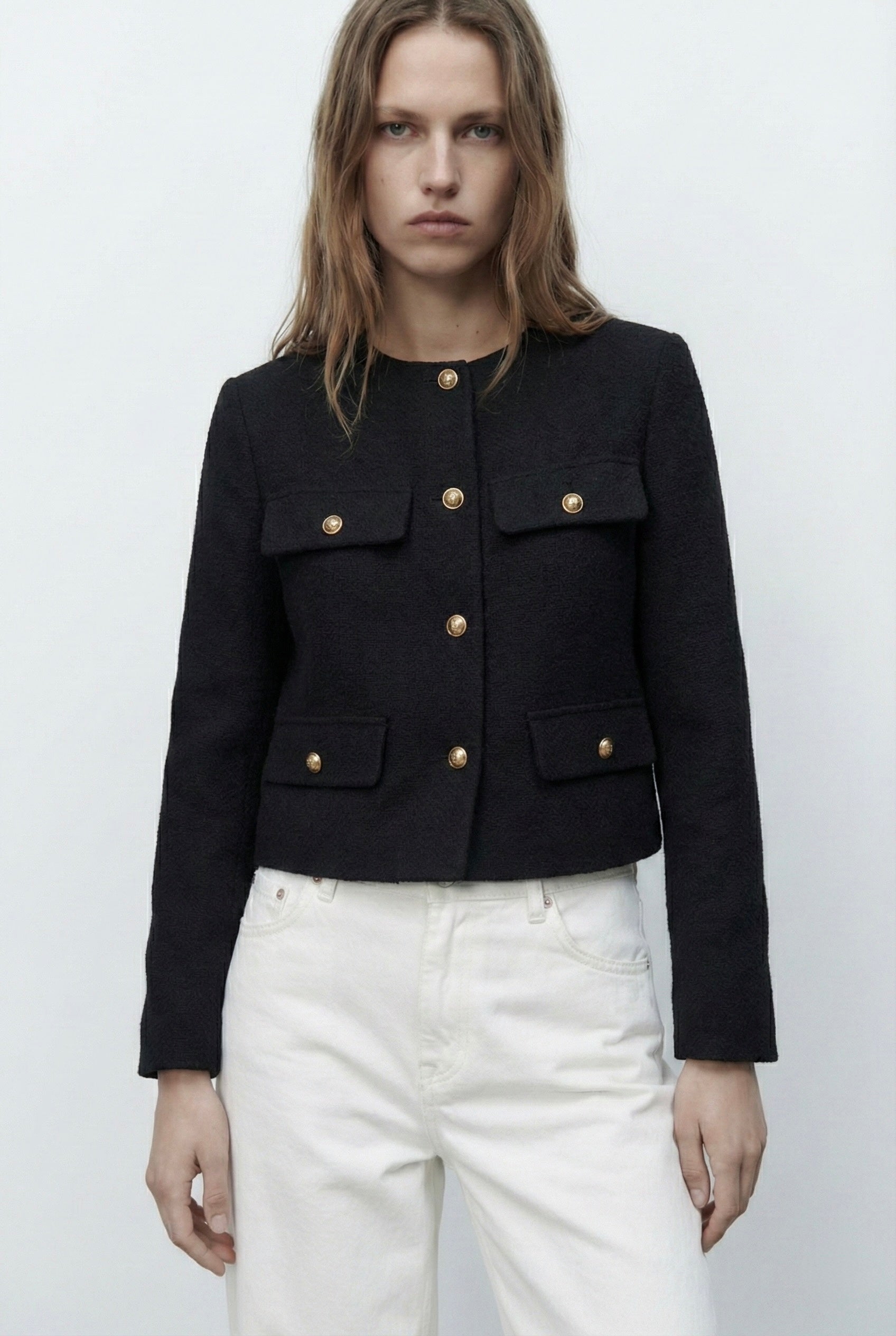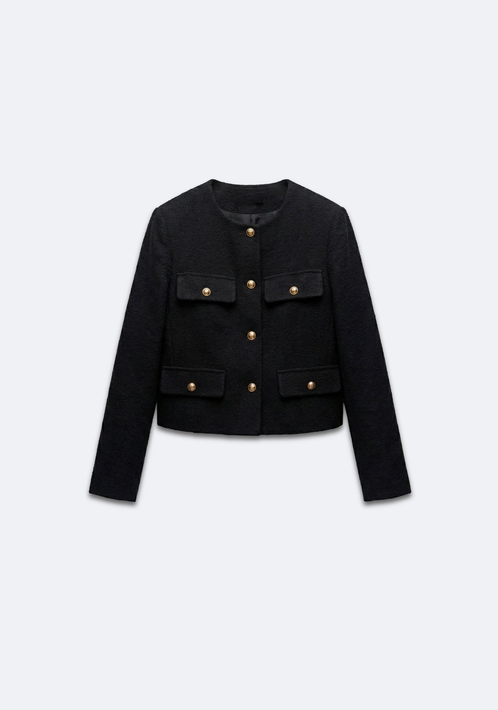 Veste structurée à col rond, fermeture par boutons décoratifs sur le devant. Deux poches plaquées poitrine et deux poches plaquées bas. Manches longues, coupe droite et longueur raccourcie. Finitions nettes au col et aux poignets