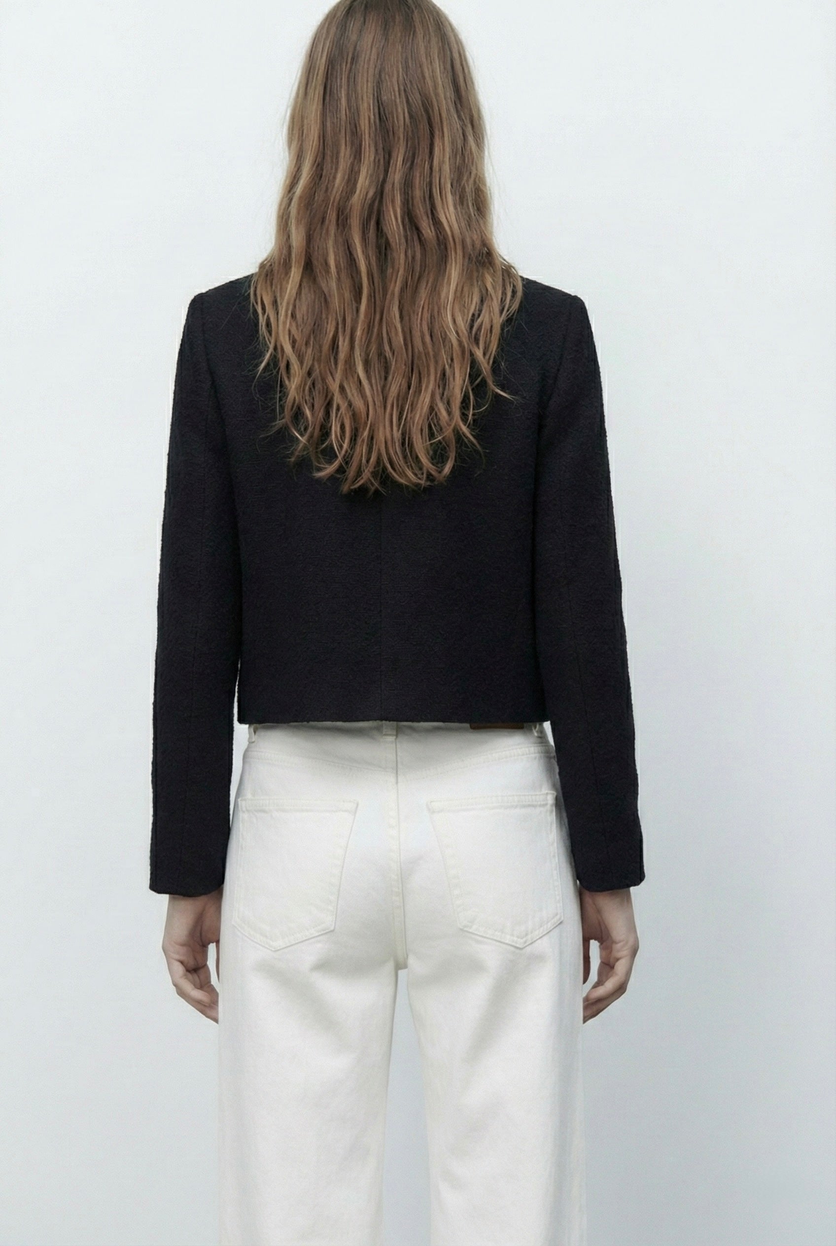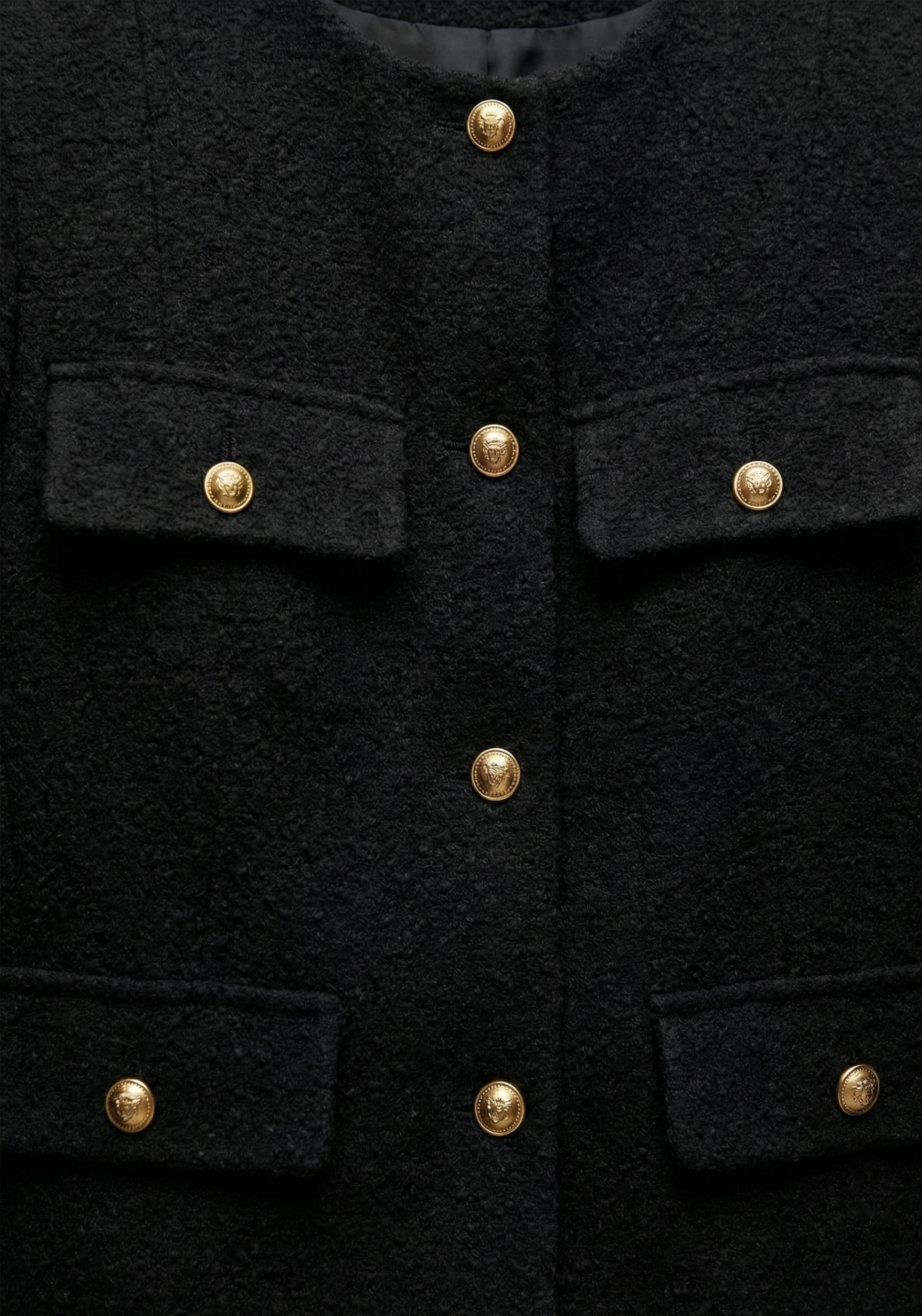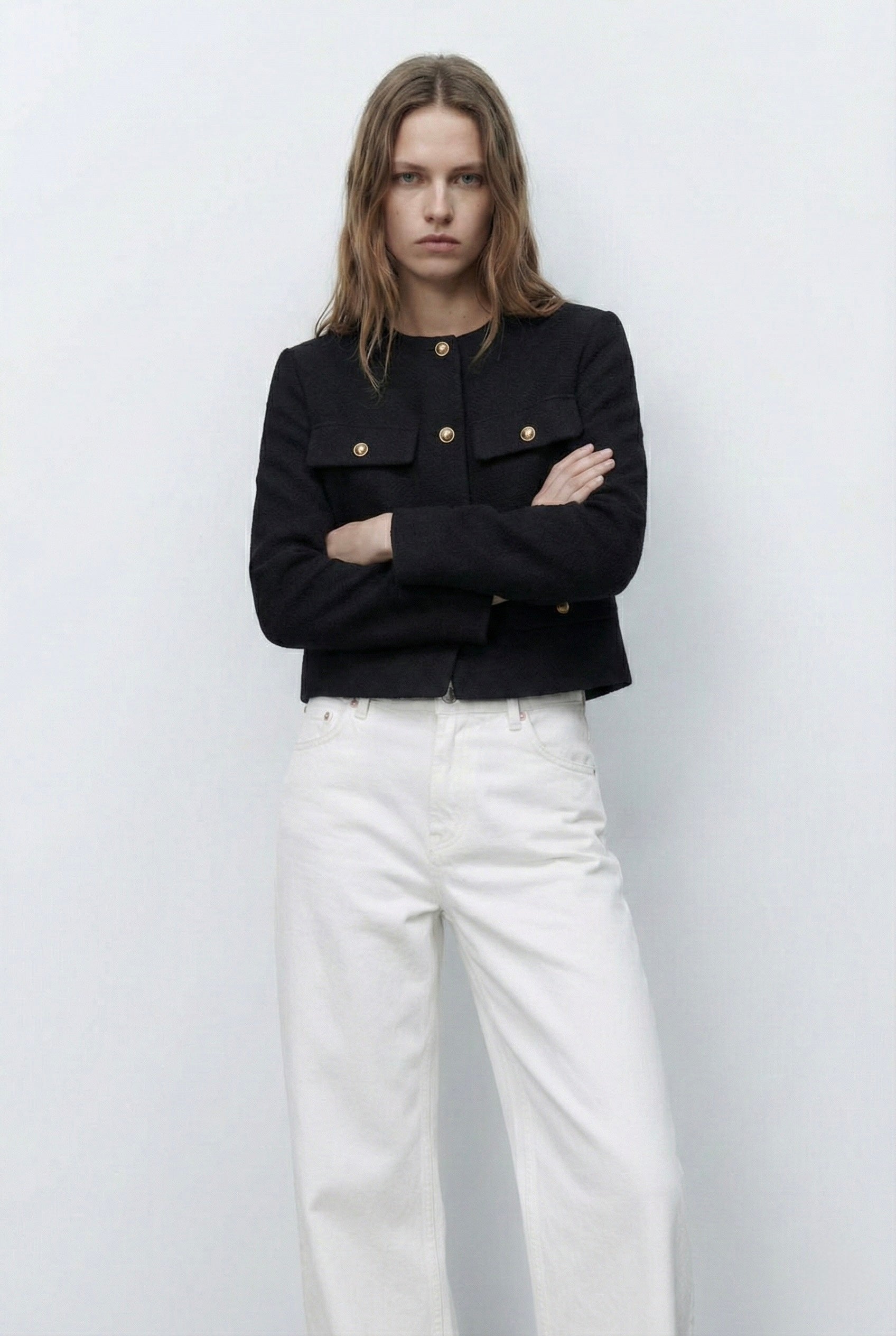 Veste structurée à col rond, fermeture par boutons décoratifs sur le devant. Deux poches plaquées poitrine et deux poches plaquées bas. Manches longues, coupe droite et longueur raccourcie. Finitions nettes au col et aux poignets