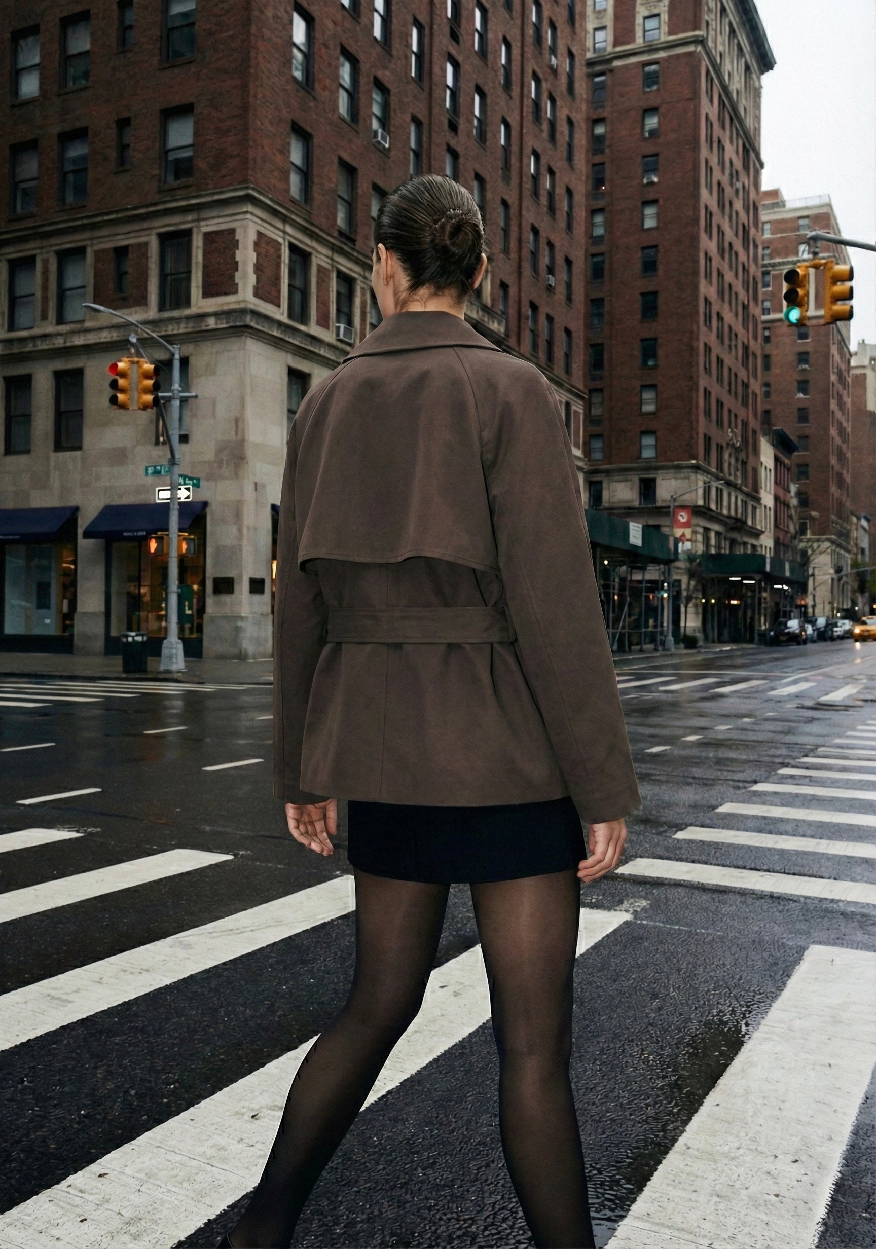 Veste à coupe droite légèrement raccourcie, construction croisée avec large col tailleur. Fermeture par boutons discrets et ceinture à nouer à la taille pour structurer la silhouette. Poches plaquées à rabat sur le devant, manches longues à ligne épurée
