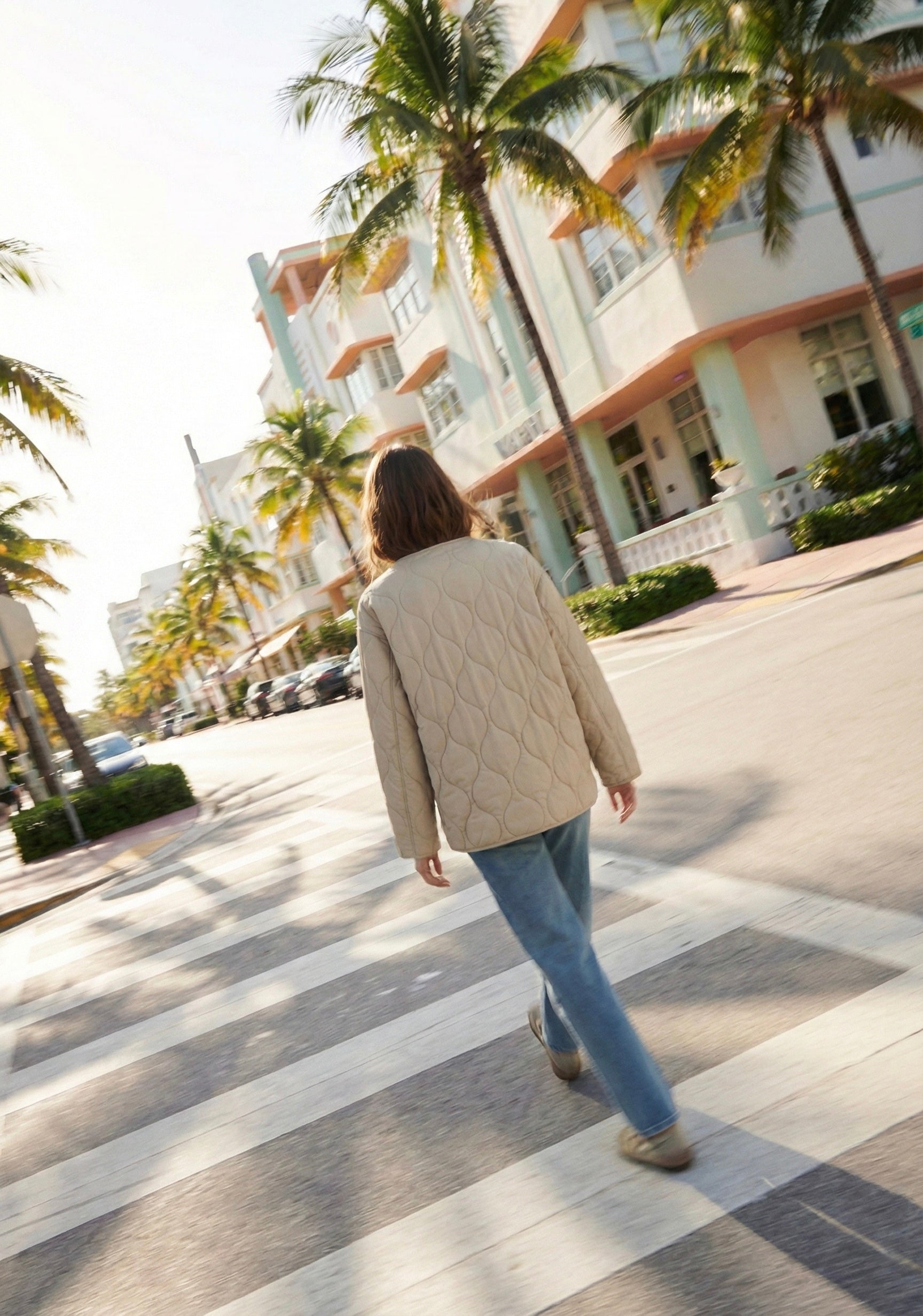 Veste matelassée à coupe droite et volume souple, col rond épuré et fermeture zippée sur le devant. Poches plaquées basses et manches longues avec revers pour une finition nette