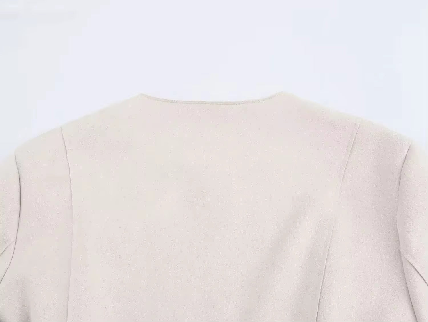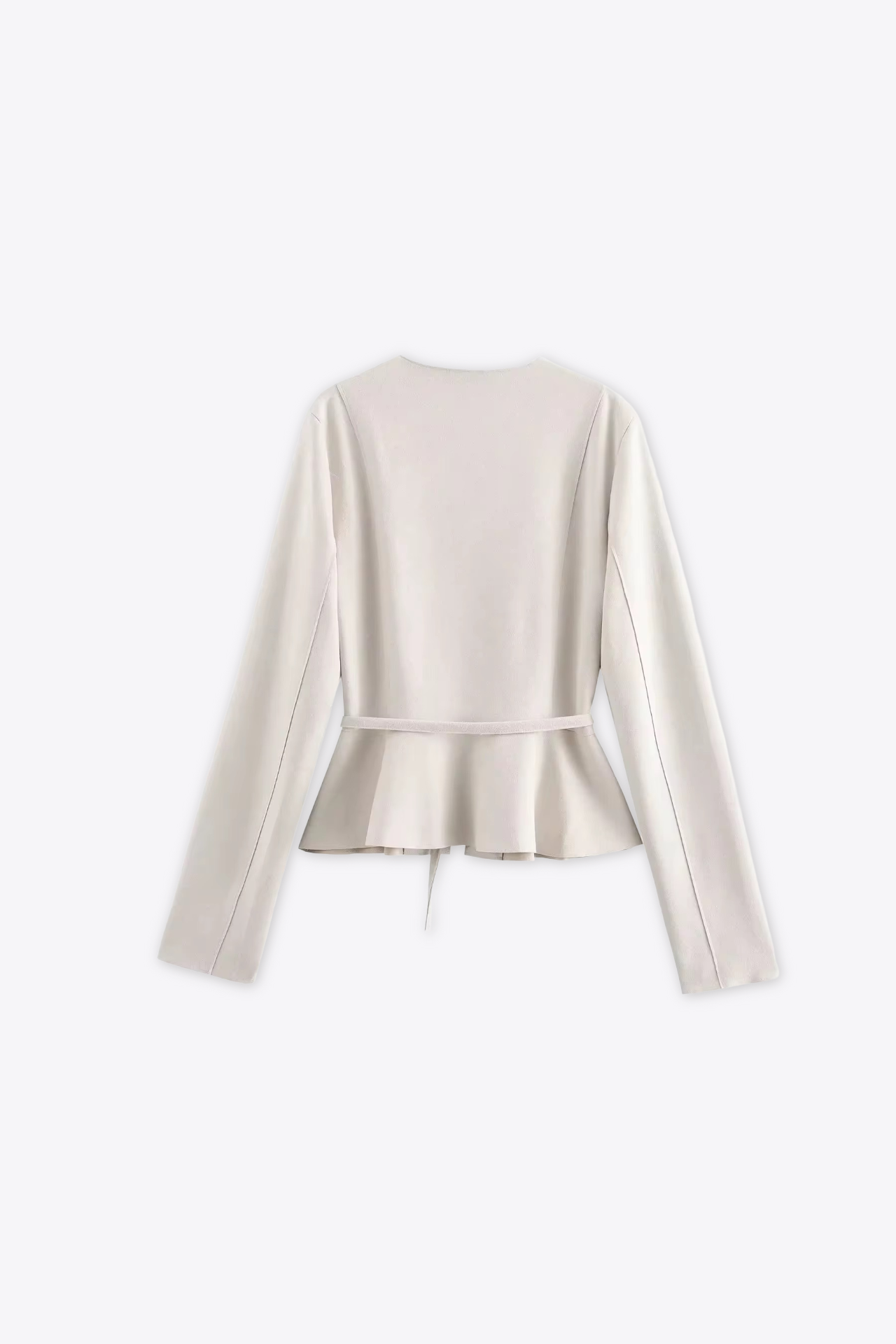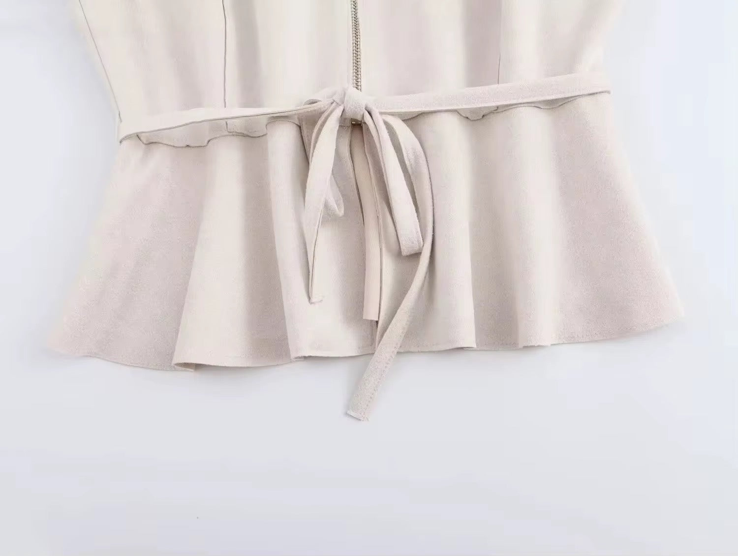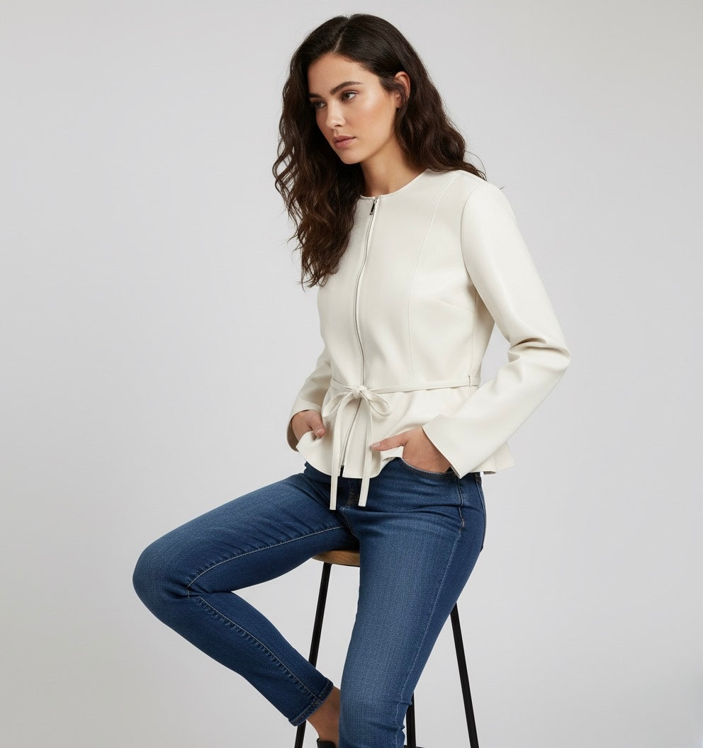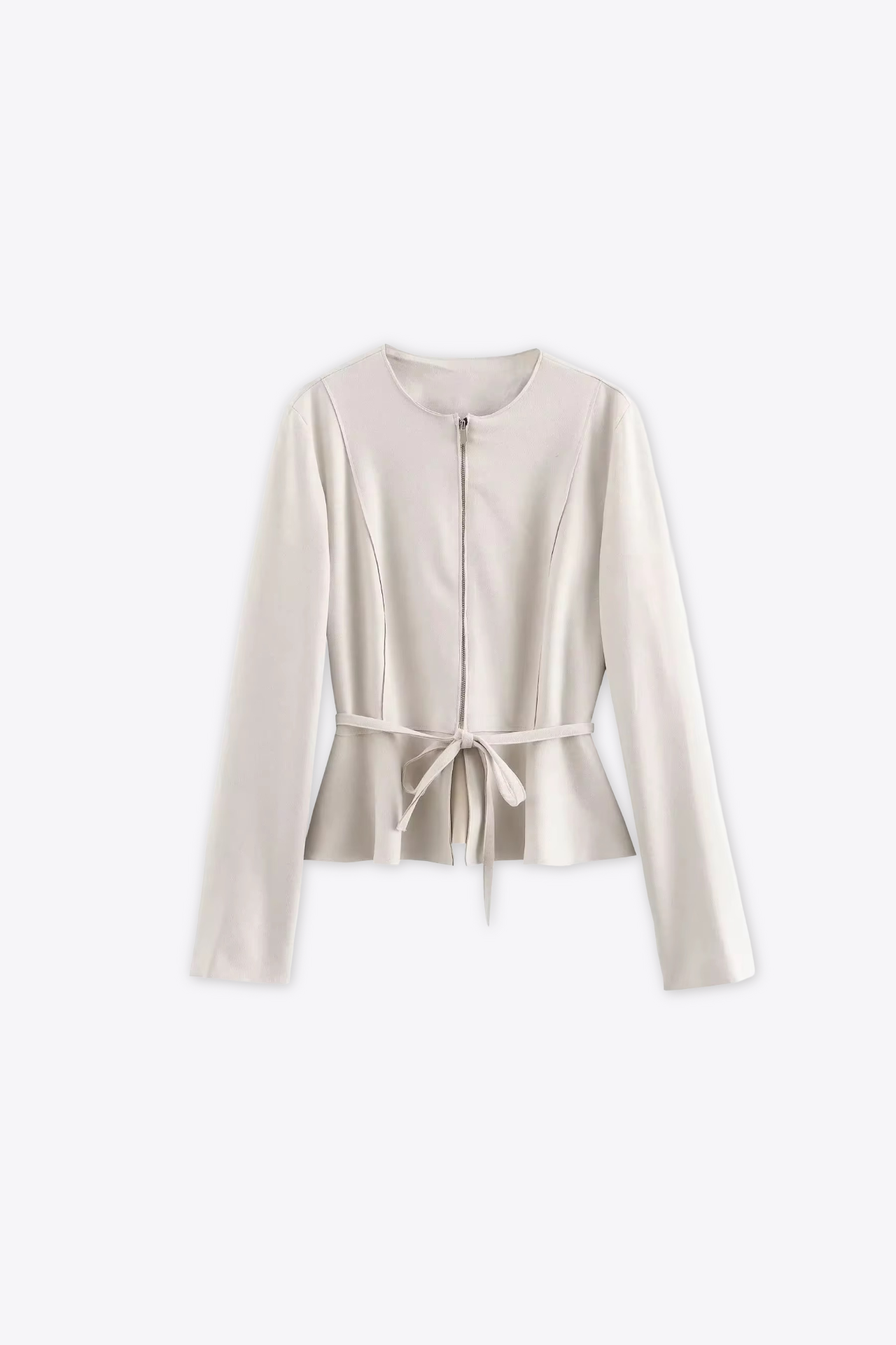 Giacca corta e ampia in tessuto liscio. Modello con scollo rotondo, maniche lunghe e chiusura con zip sul davanti. Cintura da annodare in vita. Base svasata. Completamente foderato.