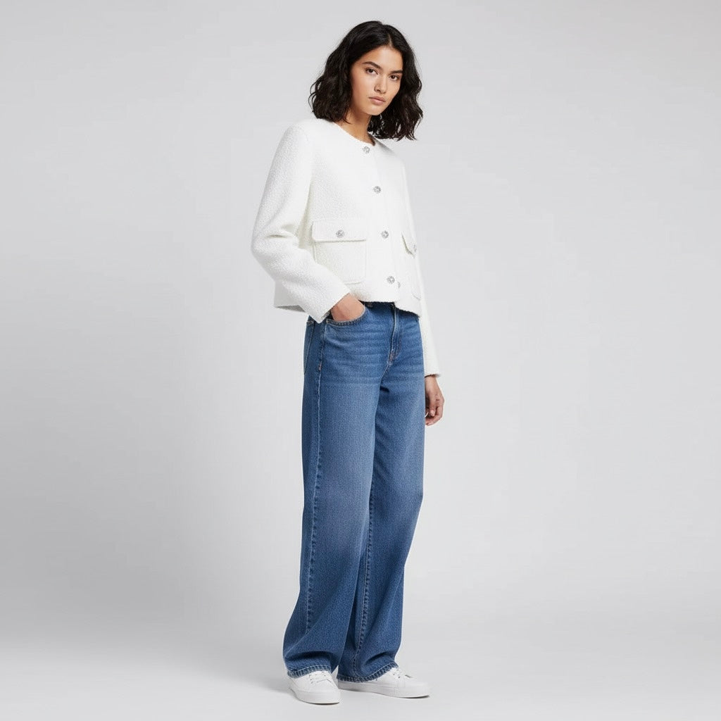 Giacca corta e ampia in tessuto bouclé. Modello con scollo rotondo, maniche lunghe e chiusura con bottoni. Tasche applicate sul davanti. Base destra. Completamente foderato.