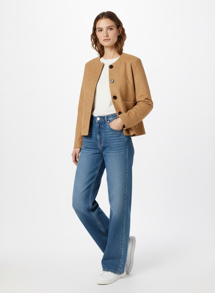 Giacca corta e ampia in tessuto morbido. Modello con scollo rotondo, maniche lunghe e chiusura con bottoni. Tasche applicate sul davanti. Base destra. Completamente foderato.