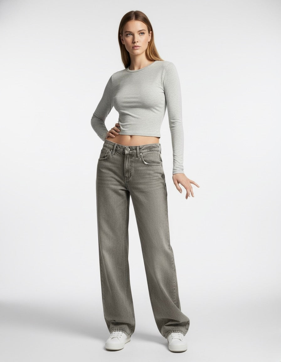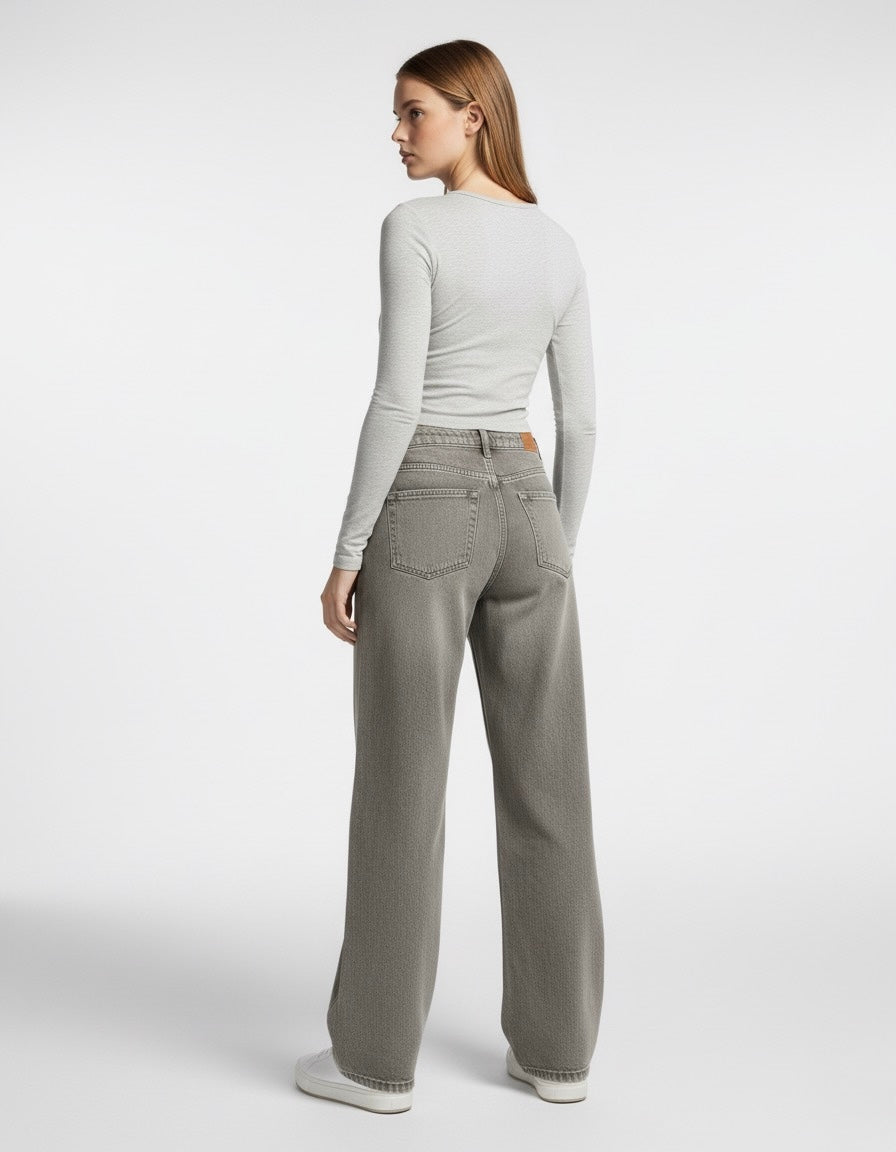Coupe droite, taille mi-haute, cinq poches. Effet délavé homogène, tissu denim rigide. Ourlet long tombant sur la chaussure, esprit minimaliste