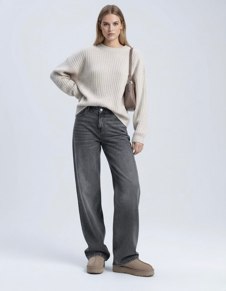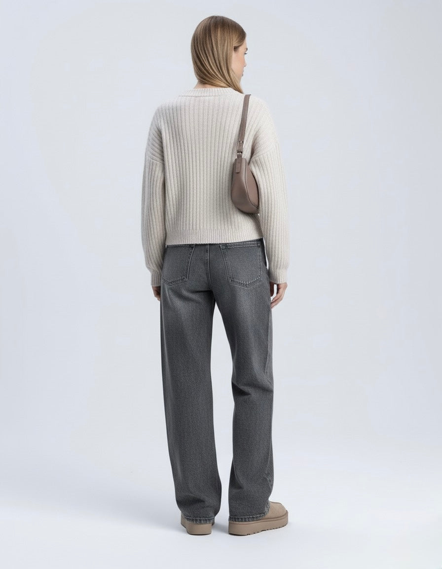 Taille mi-haute, coupe droite légèrement ample. Délavage gris moderne, matière denim dense. Style minimaliste, finition soignée au bas de jambe