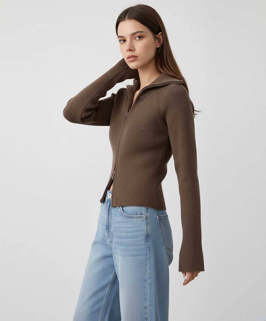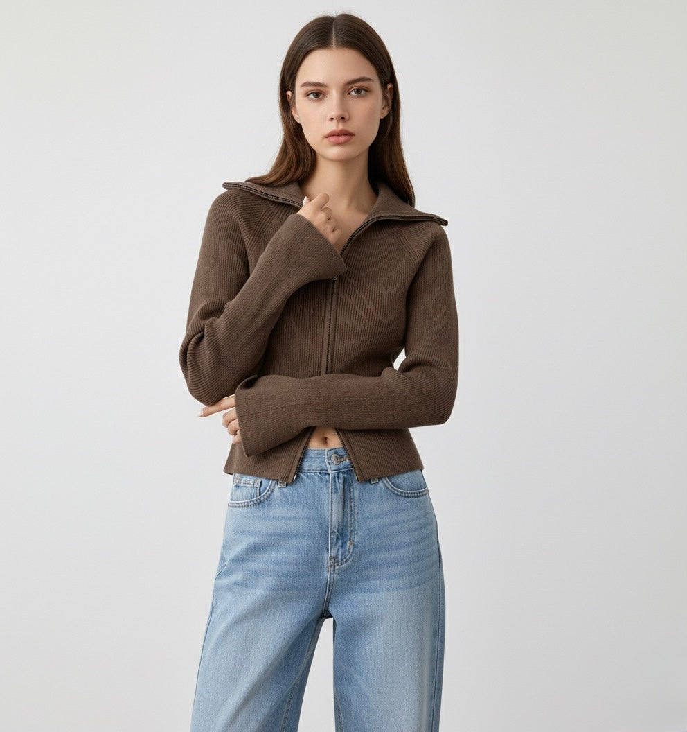 Pull en maille côtelée avec col à revers et fermeture zippée sur le devant. Coupe ajustée, manches longues légèrement évasées, finitions côtelées sur l’ensemble de la pièce.