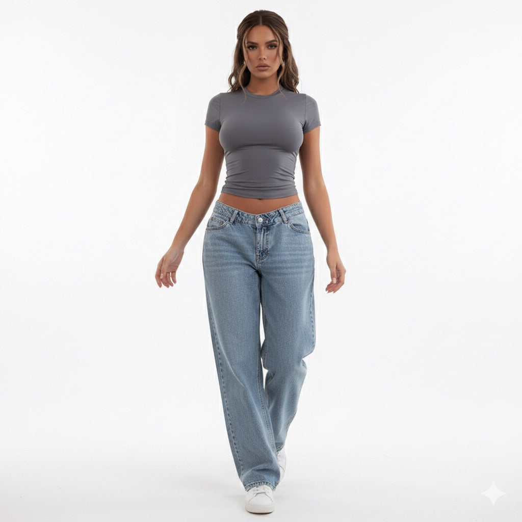 T-shirt à coupe près du corps, col rond, manches courtes, tissu extensible au toucher doux. Finition lisse et minimaliste.
