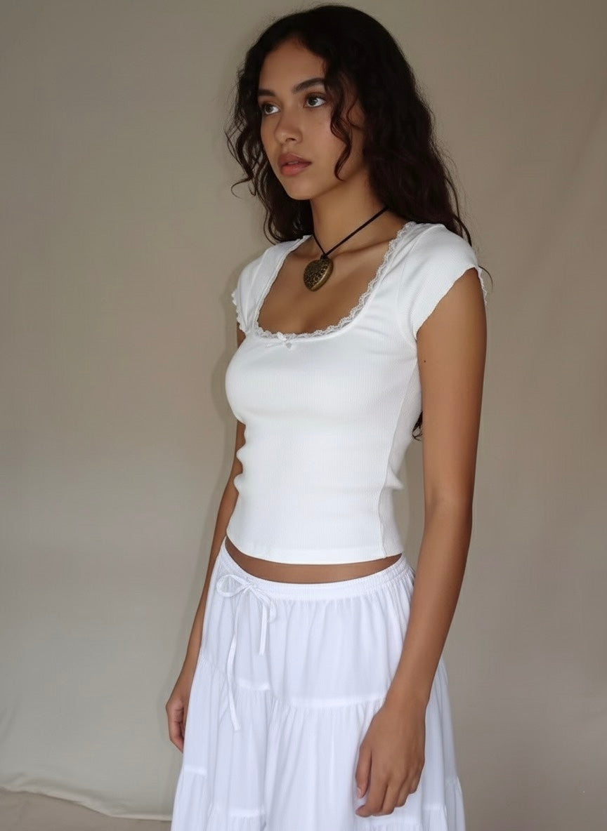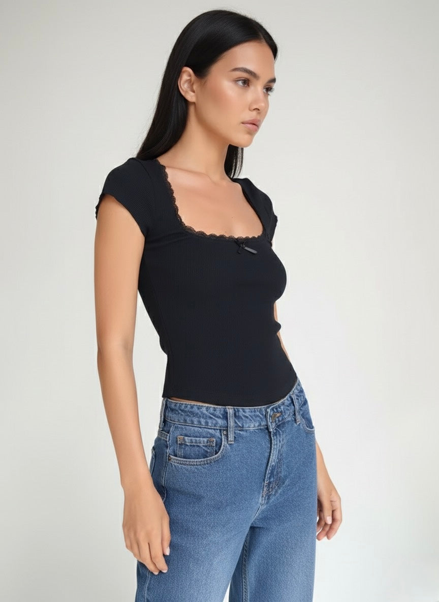 Top à manches courtes avec encolure carrée bordée de dentelle fine et petit nœud décoratif sur le devant. Matière côtelée légère et extensible.