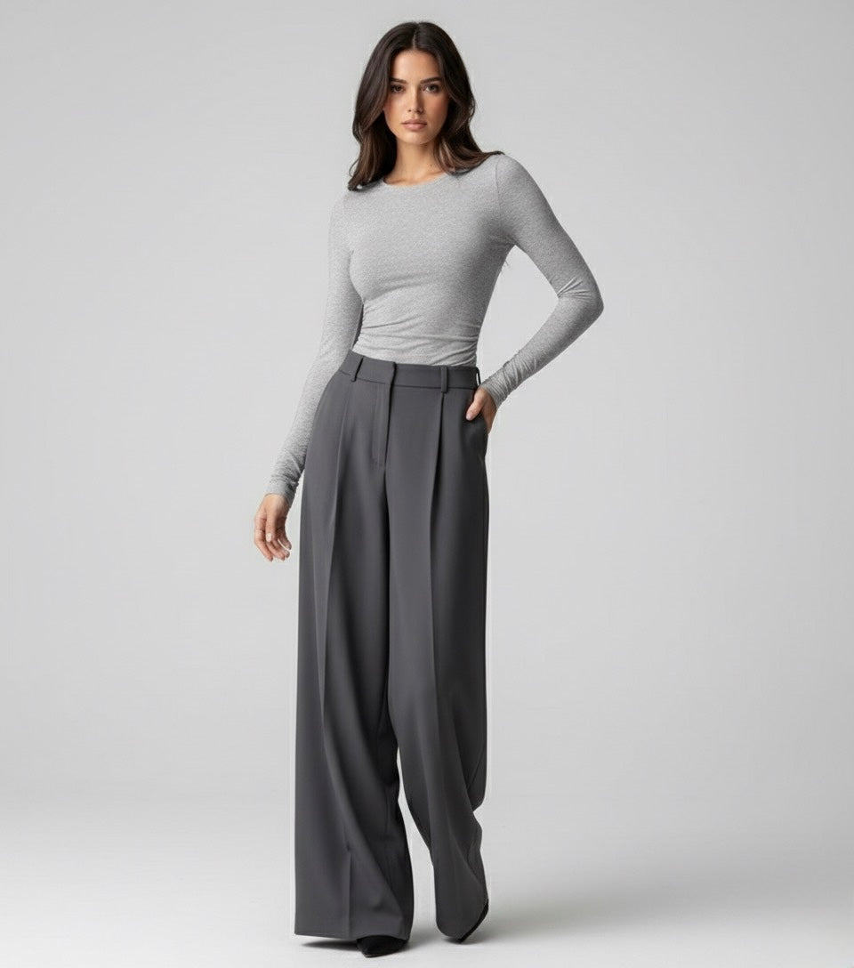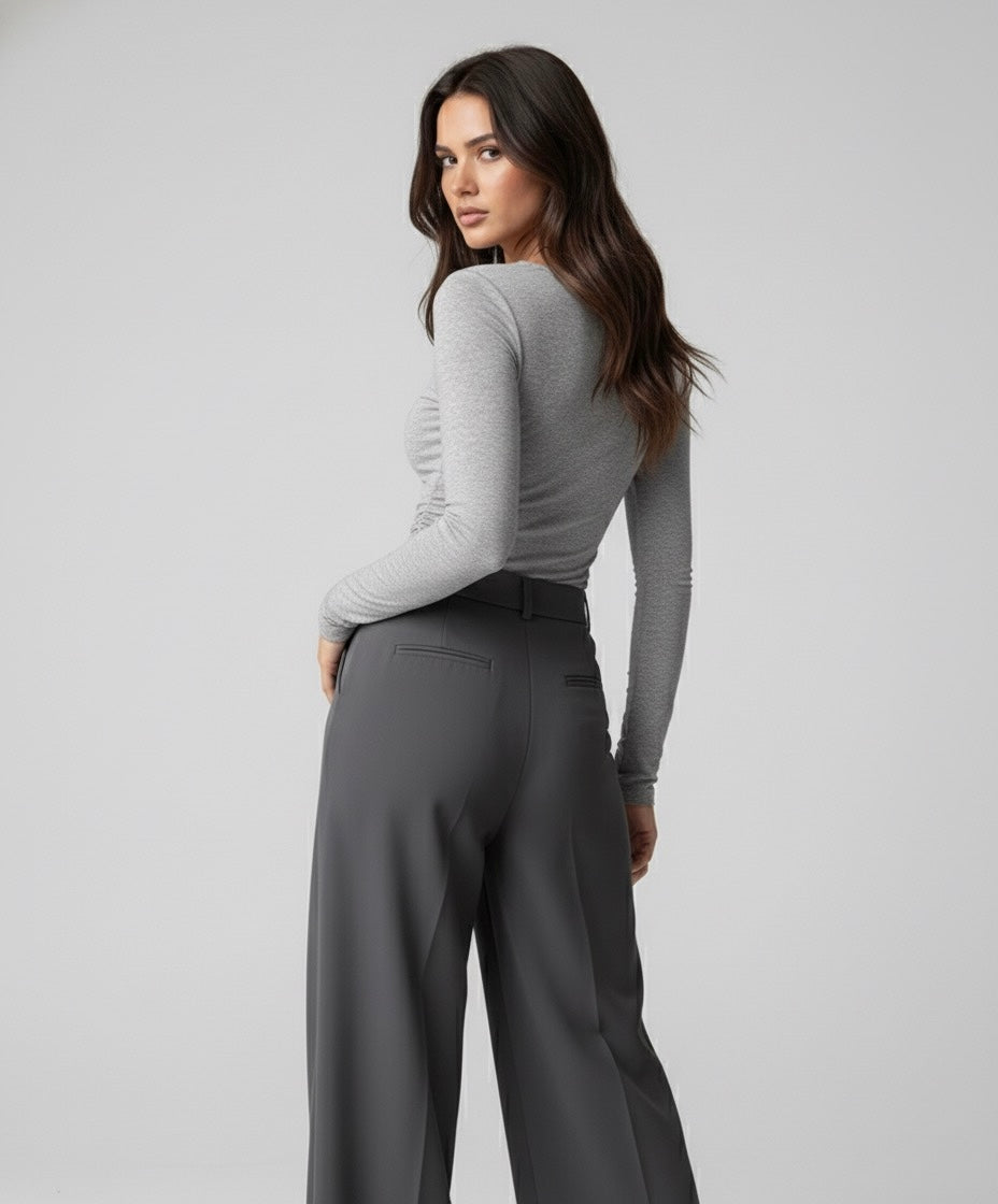 Top à manches longues, décolleté en V, coupe ajustée, texture côtelée fine et souple.