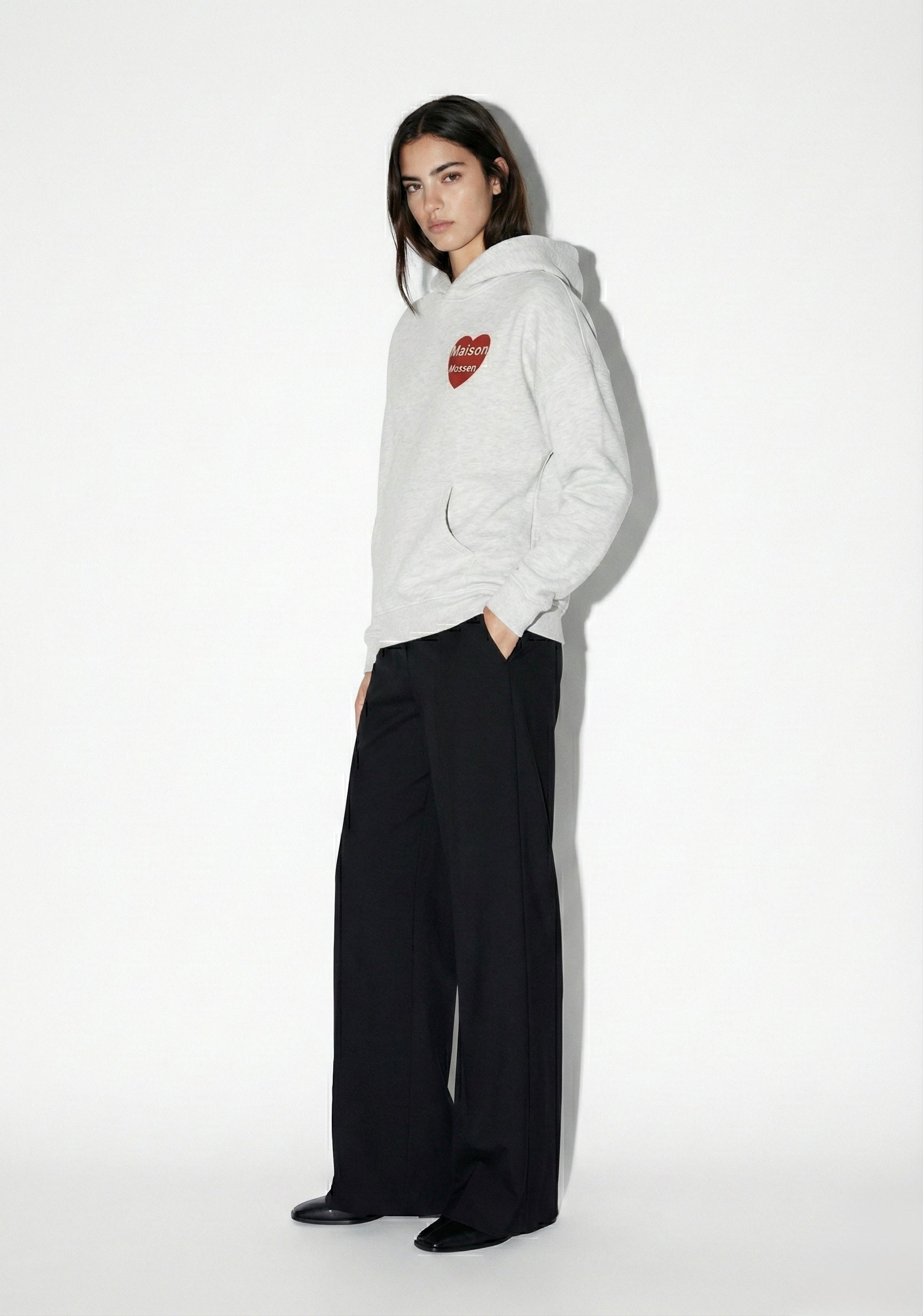Sweat à capuche à coupe droite avec capuche montée et finitions en bord-côte. Dos imprimé d’un motif cœur central intégrant une typographie contrastée. Manches longues, épaules légèrement tombantes et construction structurée