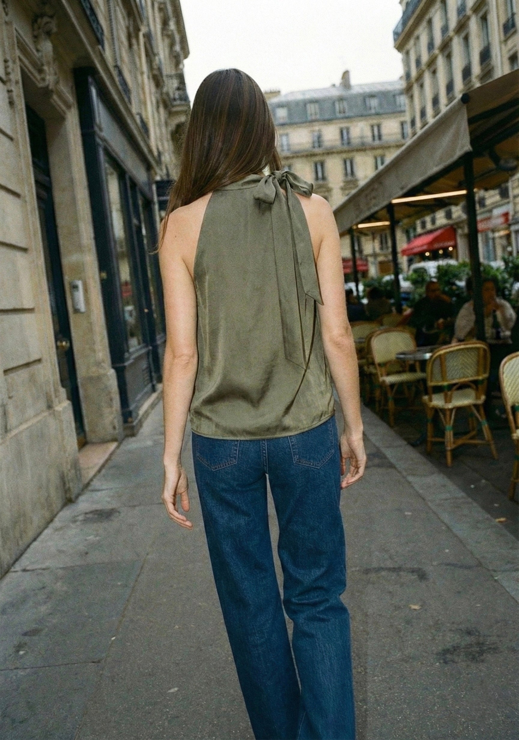 Haut sans manches à col montant avec lien à nouer. Coupe ample avec plis discrets sur le devant. Base resserrée.