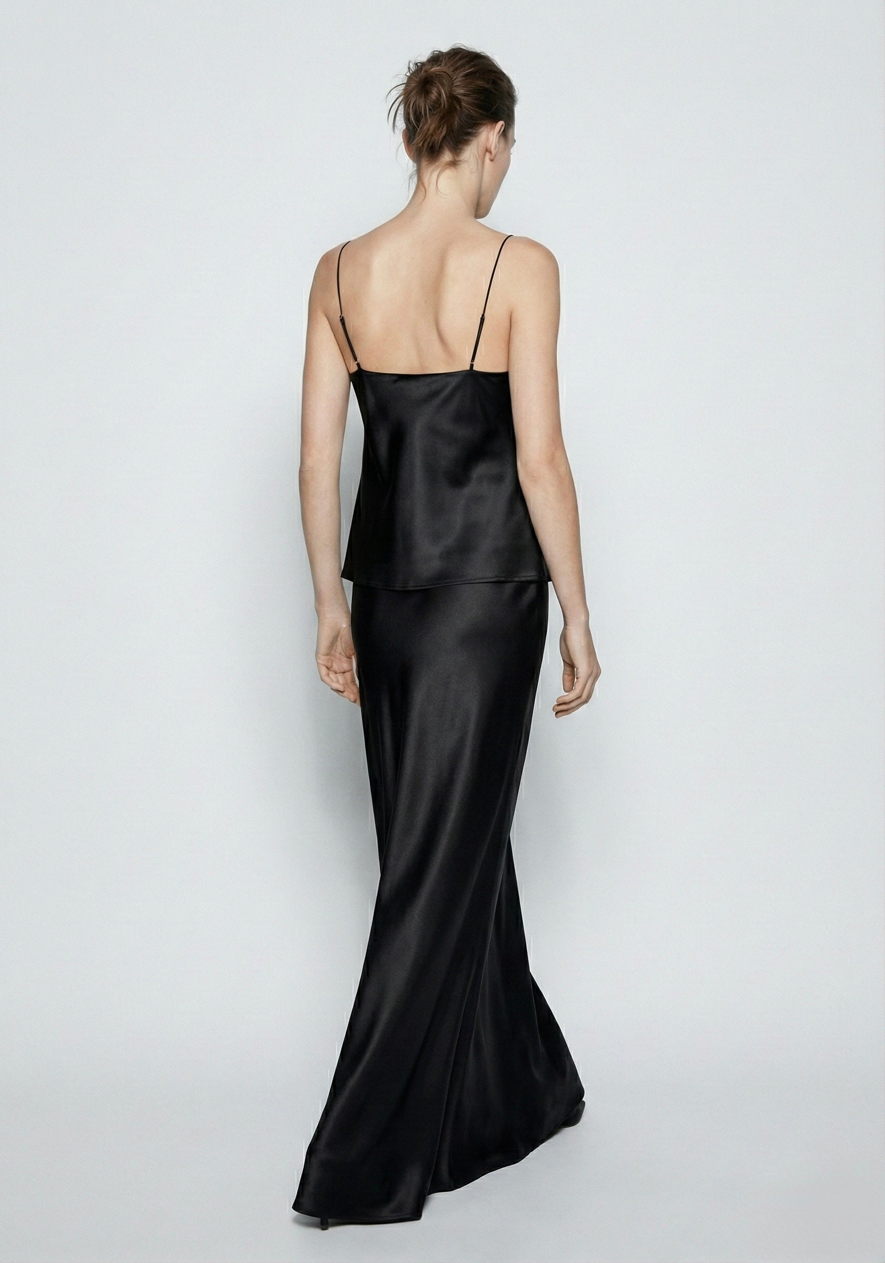 Haut fluide à décolleté en V avec bonnets légèrement structurés. Bretelles fines réglables. Coupe droite avec base légèrement évasée.