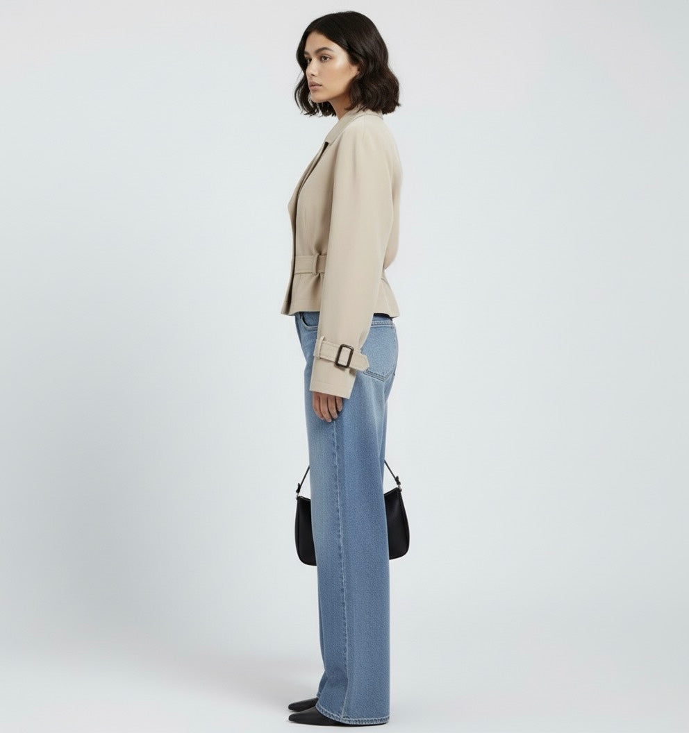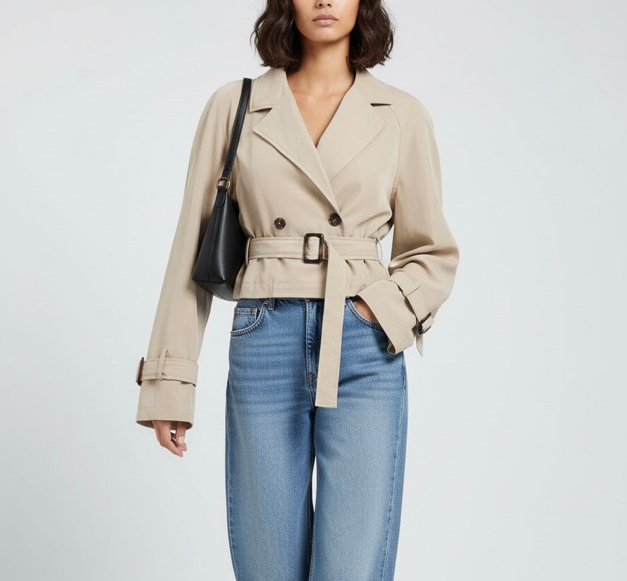 Veste courte croisée à col à revers, double boutonnage et ceinture assortie avec boucle métallique. Manches longues avec pattes réglables aux poignets. Coupe structurée soulignant la taille.
