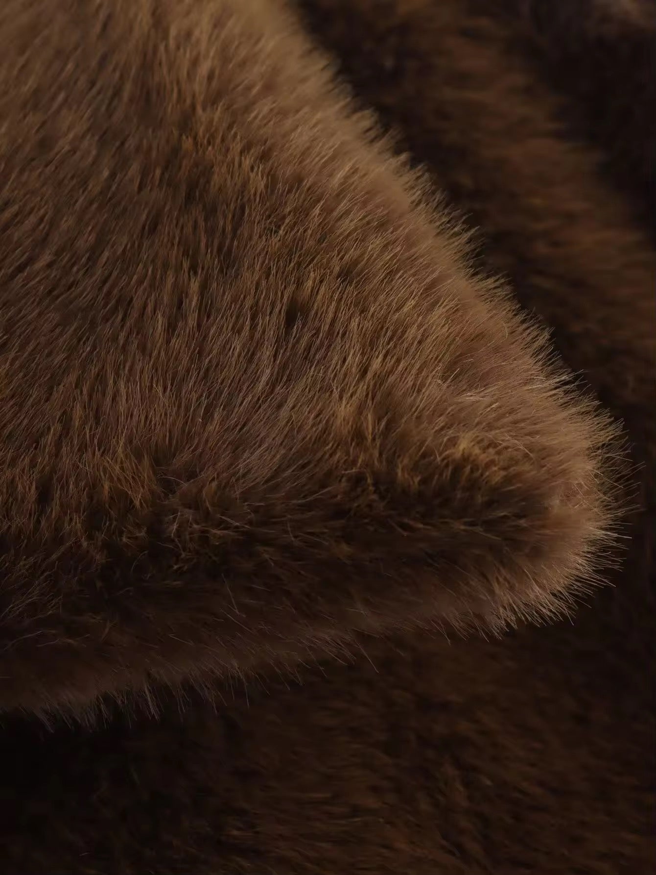 Veste structurée à col à revers larges, fermeture dissimulée sur le devant. Manches longues et coupe droite légèrement ample. Texture douce à effet fourrure apportant volume et confort.