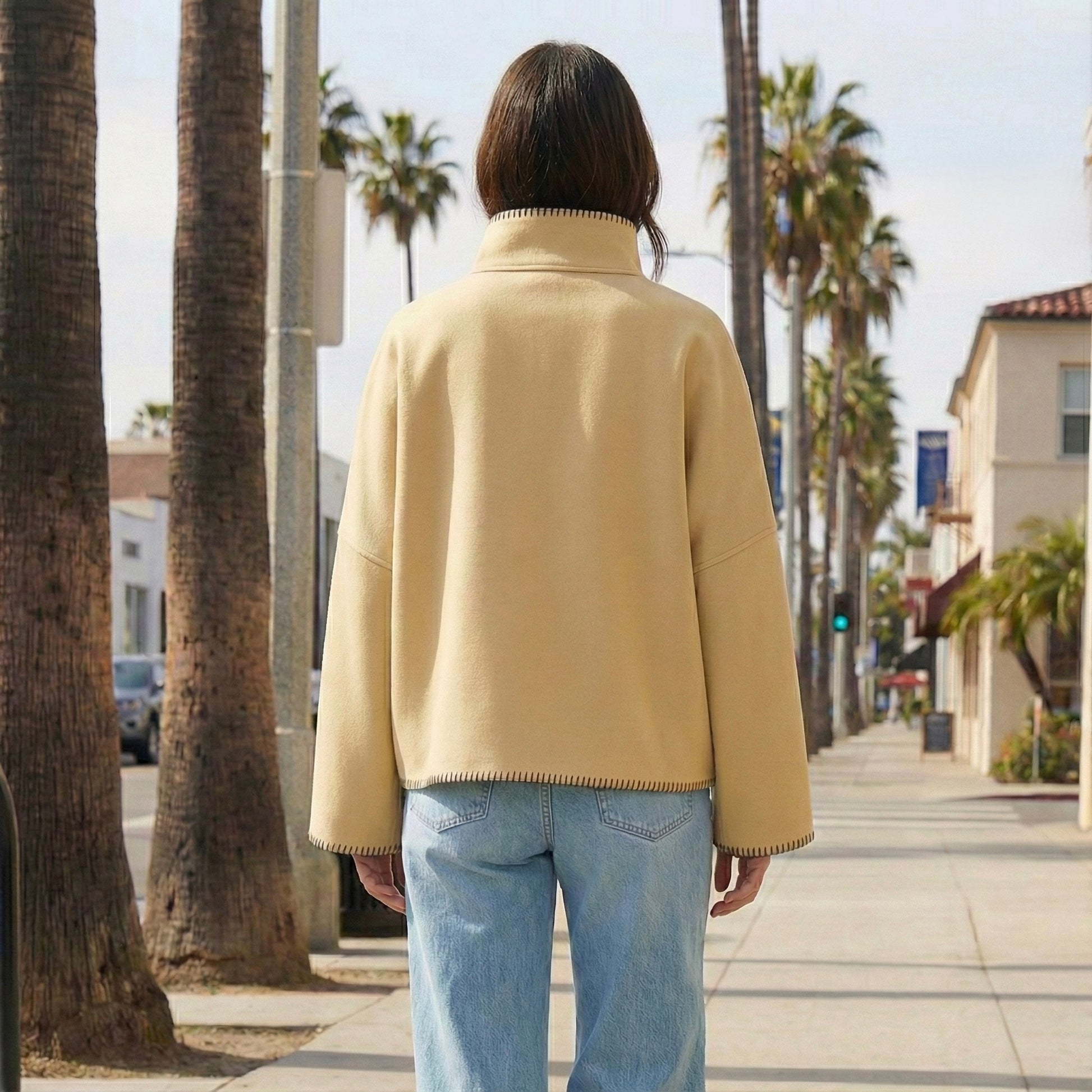 VESTE DROITE À COL MONTANT ET SURPIQÛRES VISIBLES