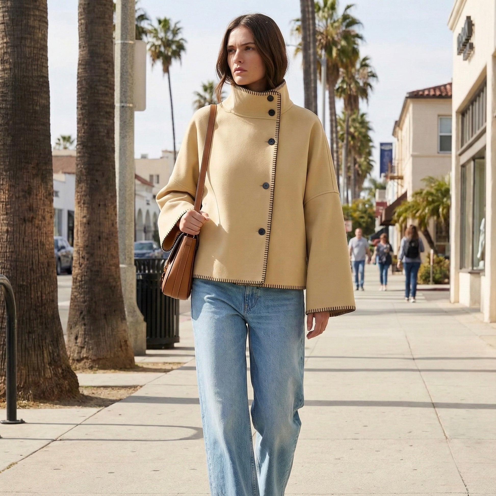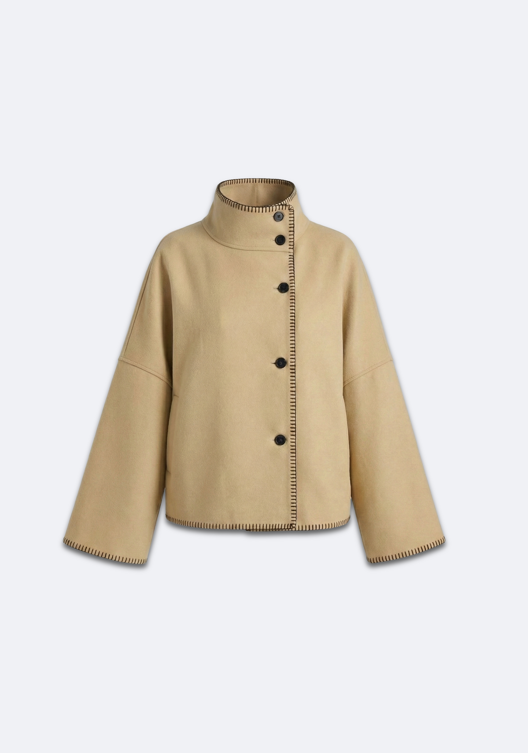 Veste à coupe droite et volume fluide, col montant structuré avec fermeture boutonnée décalée. Surpiqûres apparentes sur les bords pour une finition graphique. Manches longues à ligne épurée