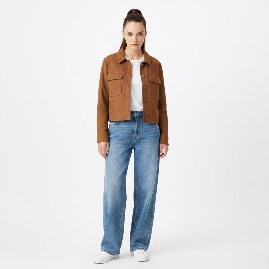 Giacca con collo lungo e maniche lunghe. Tasche anteriori con profili. Chiusura con bottoni sul davanti.