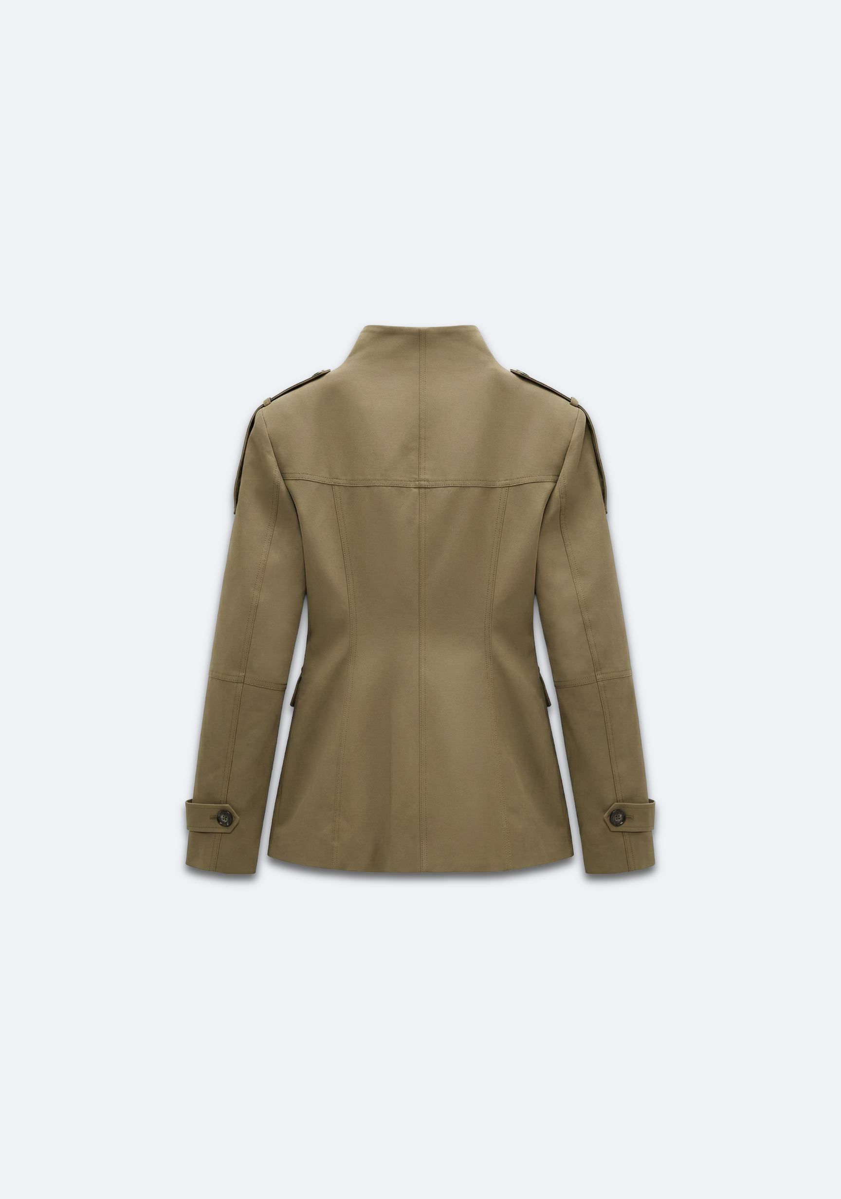 Conçue avec un souci méticuleux du détail, cette veste se distingue par son col officier rigoureux et son boutonnage frontal complet. L'influence militaire est soulignée par des épaulettes boutonnées et un jeu de quatre poches à rabat, offrant à la fois fonctionnalité et relief à la silhouette. Les découpes verticales et les finitions aux poignets témoignent d'un savoir-faire tailleur de haute précision.