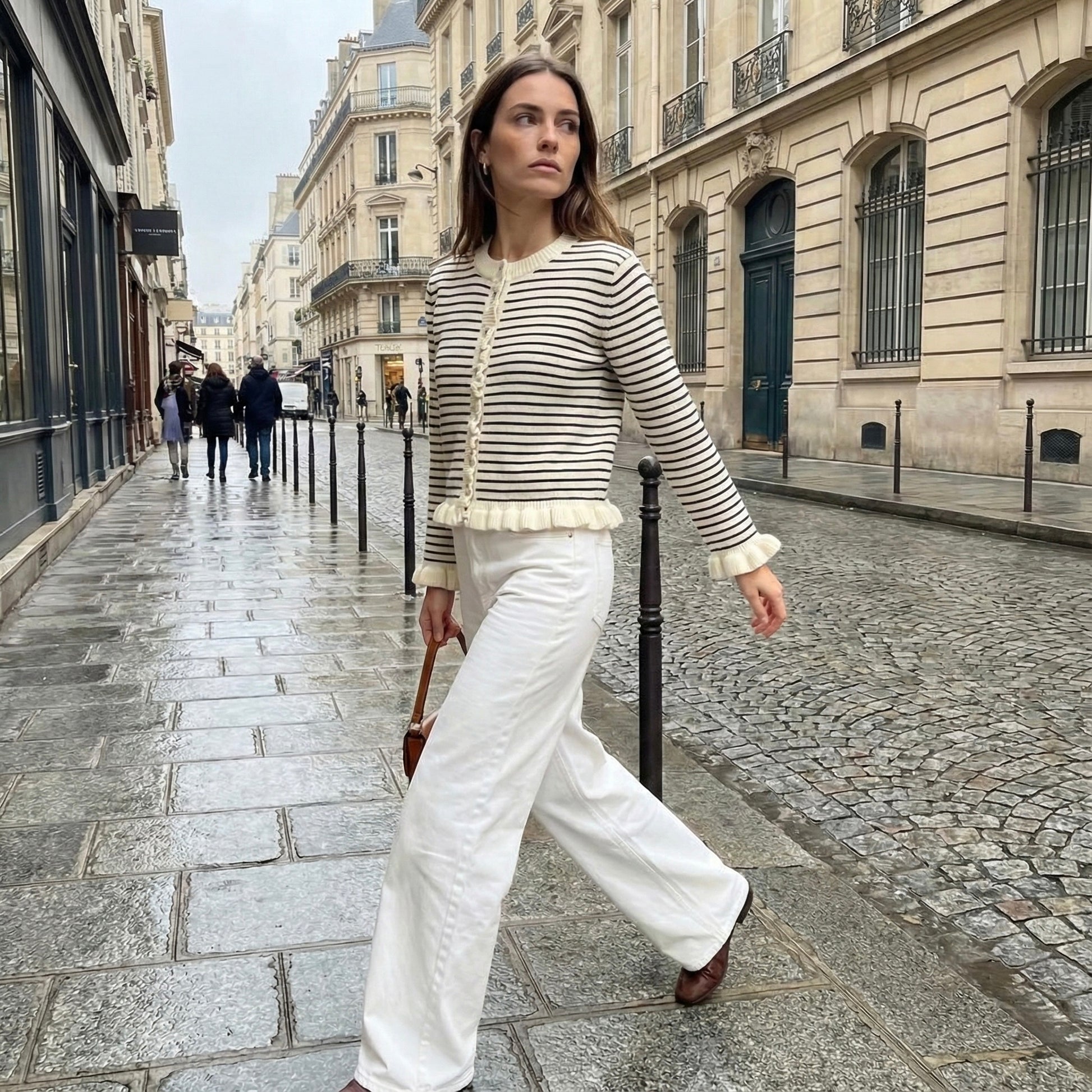 CARDIGAN RAYÉ À FINITIONS VOLANTÉES