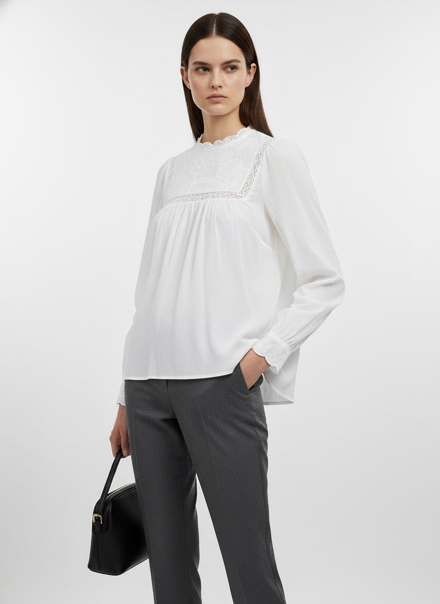 Blouse fluide à manches longues bouffantes. Détails en dentelle brodée sur le buste et le col. Fronces subtiles sous la poitrine. Fermeture goutte au dos avec boutons.