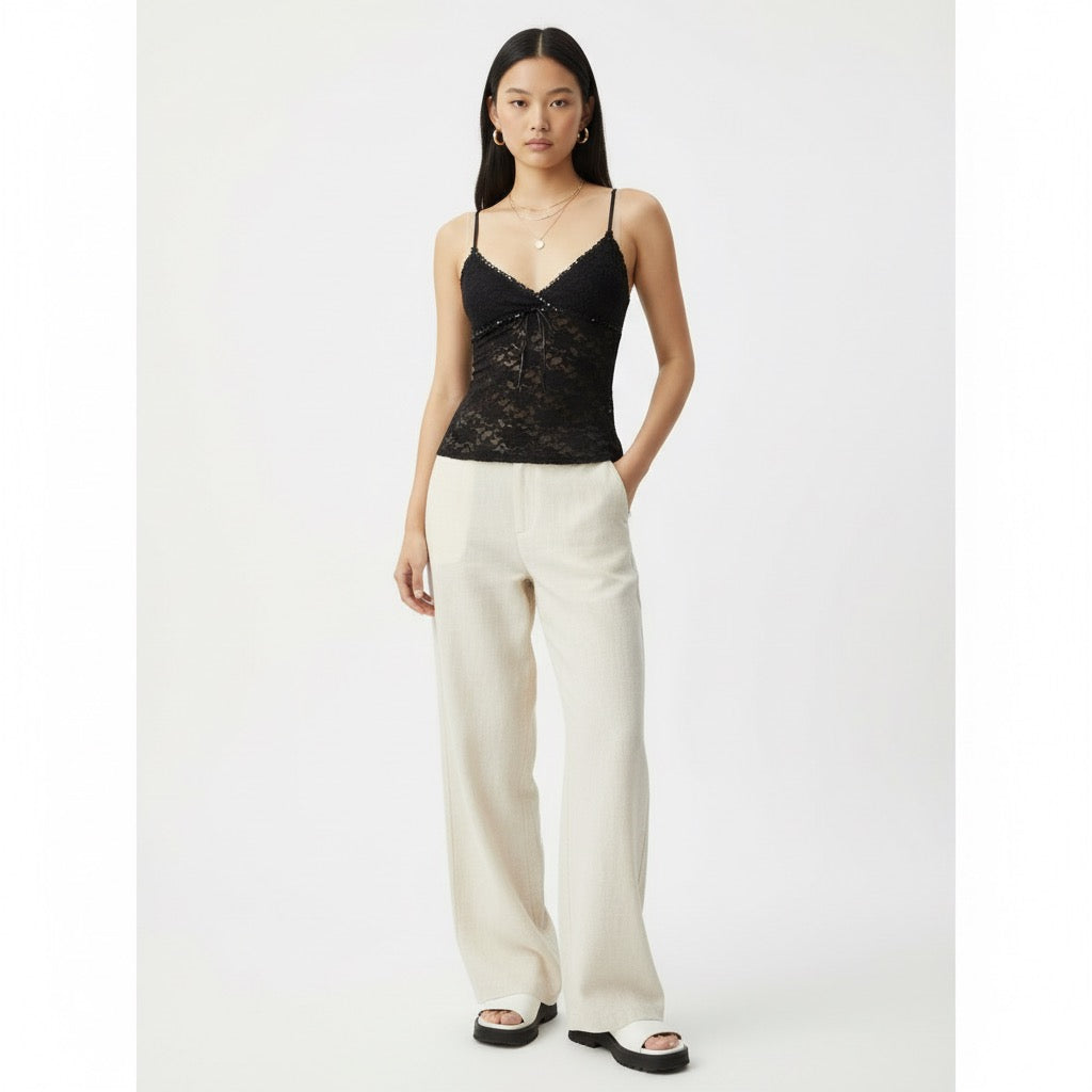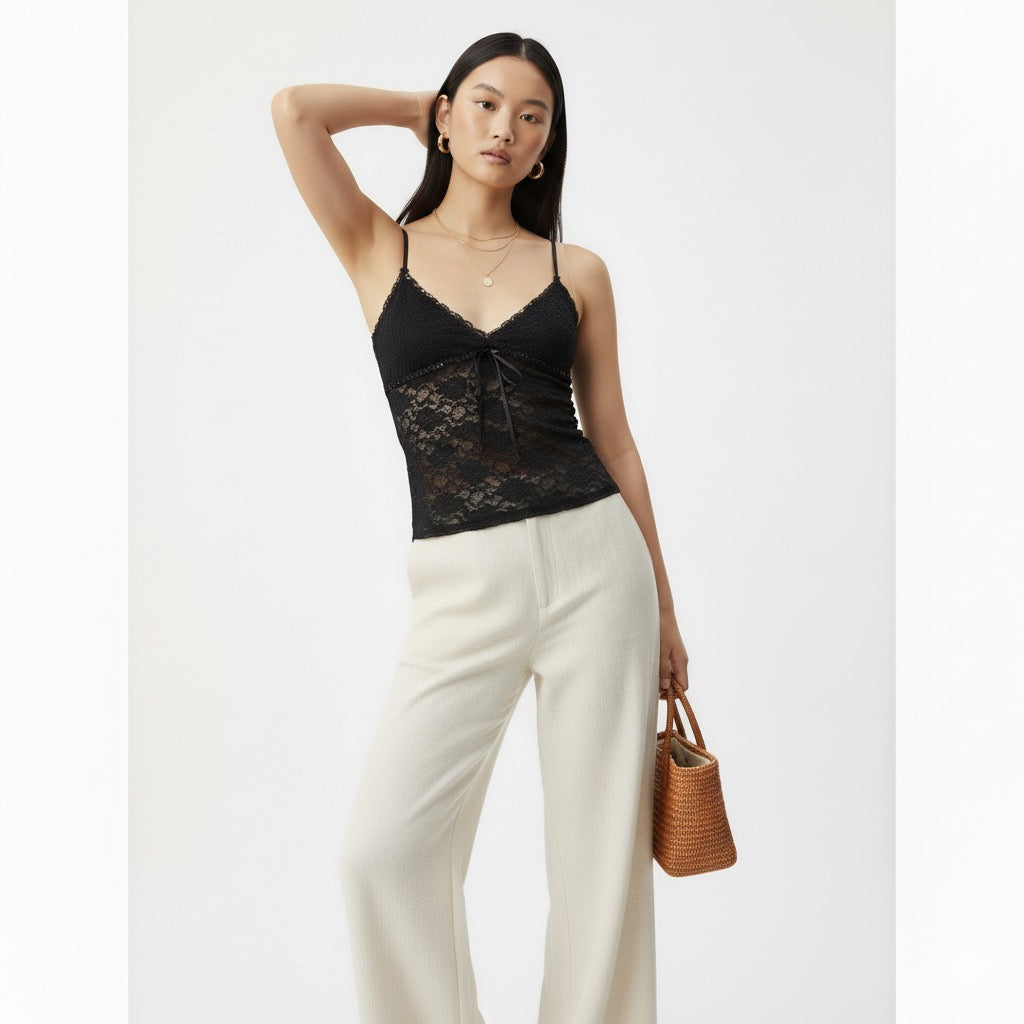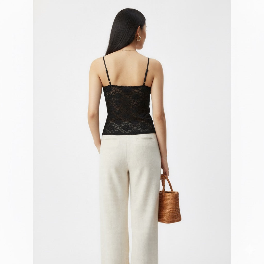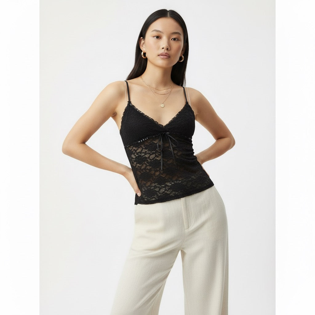 Débardeur ajusté en dentelle florale semi-transparente avec fines bretelles réglables. Décolleté en V et lien à nouer sur le devant. Finition bordée de galon délicat.