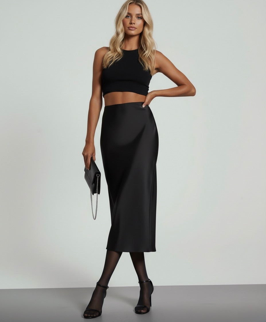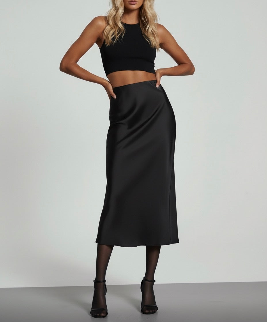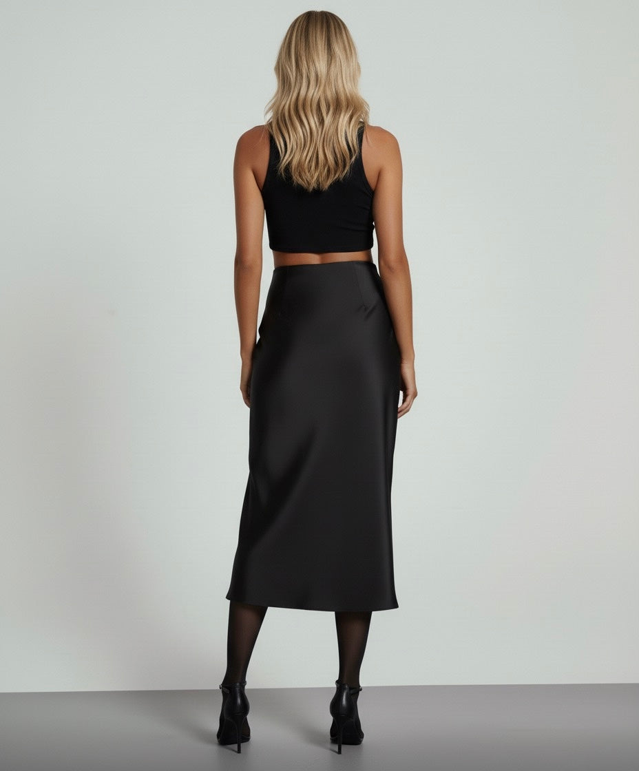 Jupe longue taille haute, coupe droite évasée, tombé fluide en tissu satiné avec ceinture fine intégrée et finition lisse au dos.