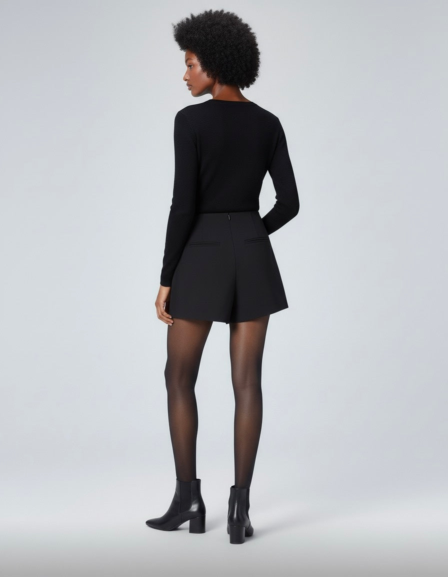 Jupe-short portefeuille à effet croisé sur le devant, fermeture latérale zippée invisible, finitions nettes et structure ajustée inspirée du tailoring.
