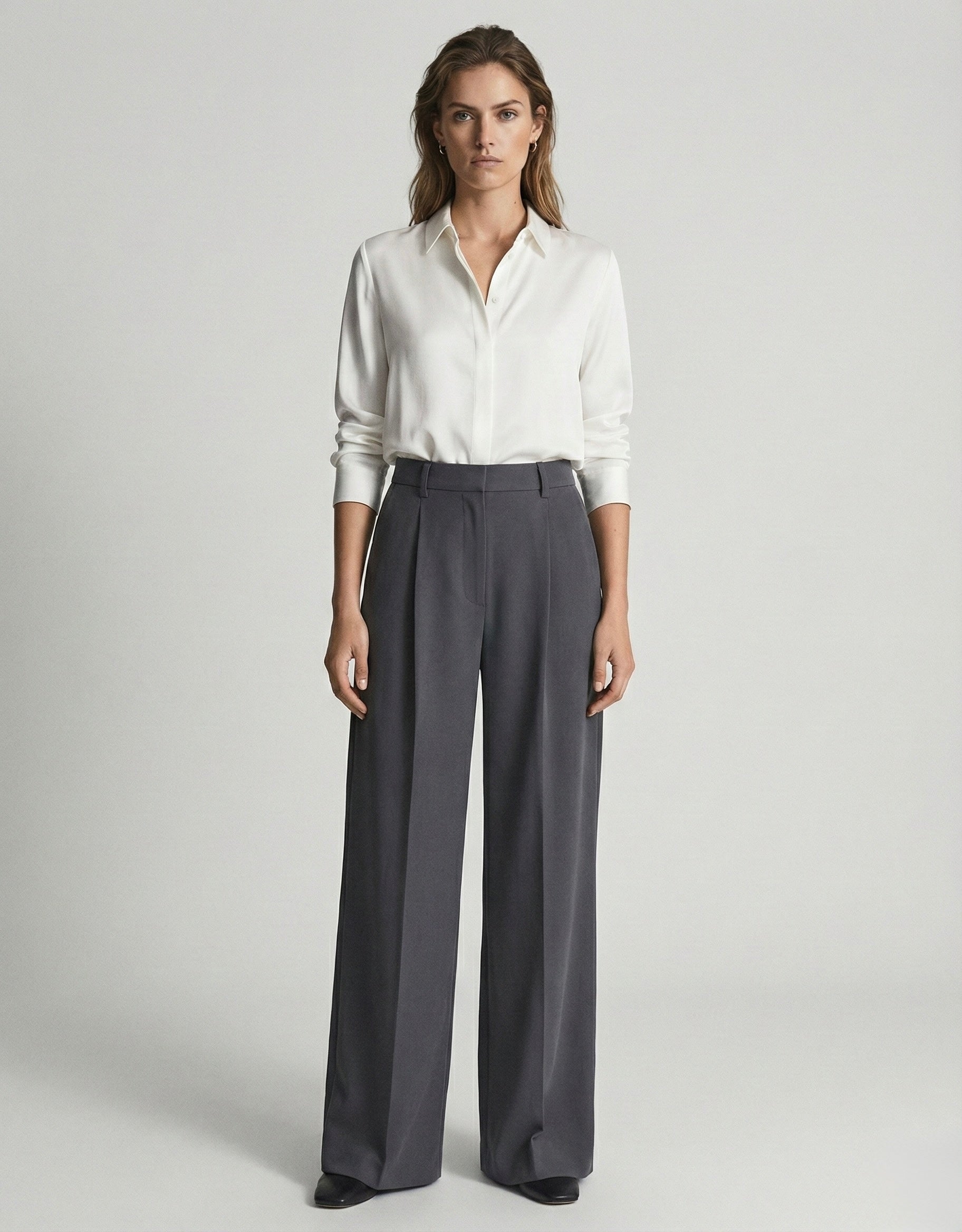 Construction droite, plis frontaux, taille haute stabilisée, jambe étendue pour un tombé linéaire