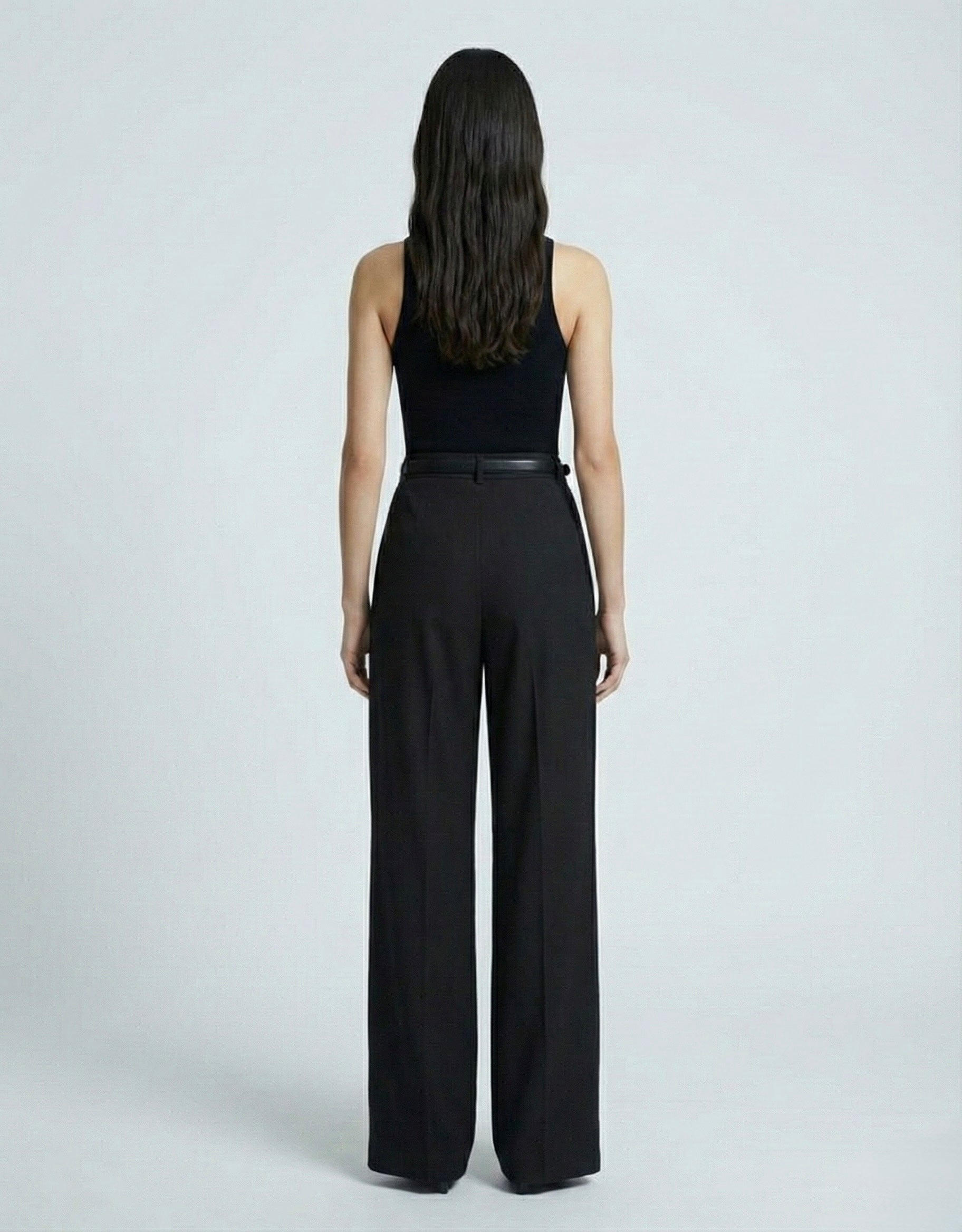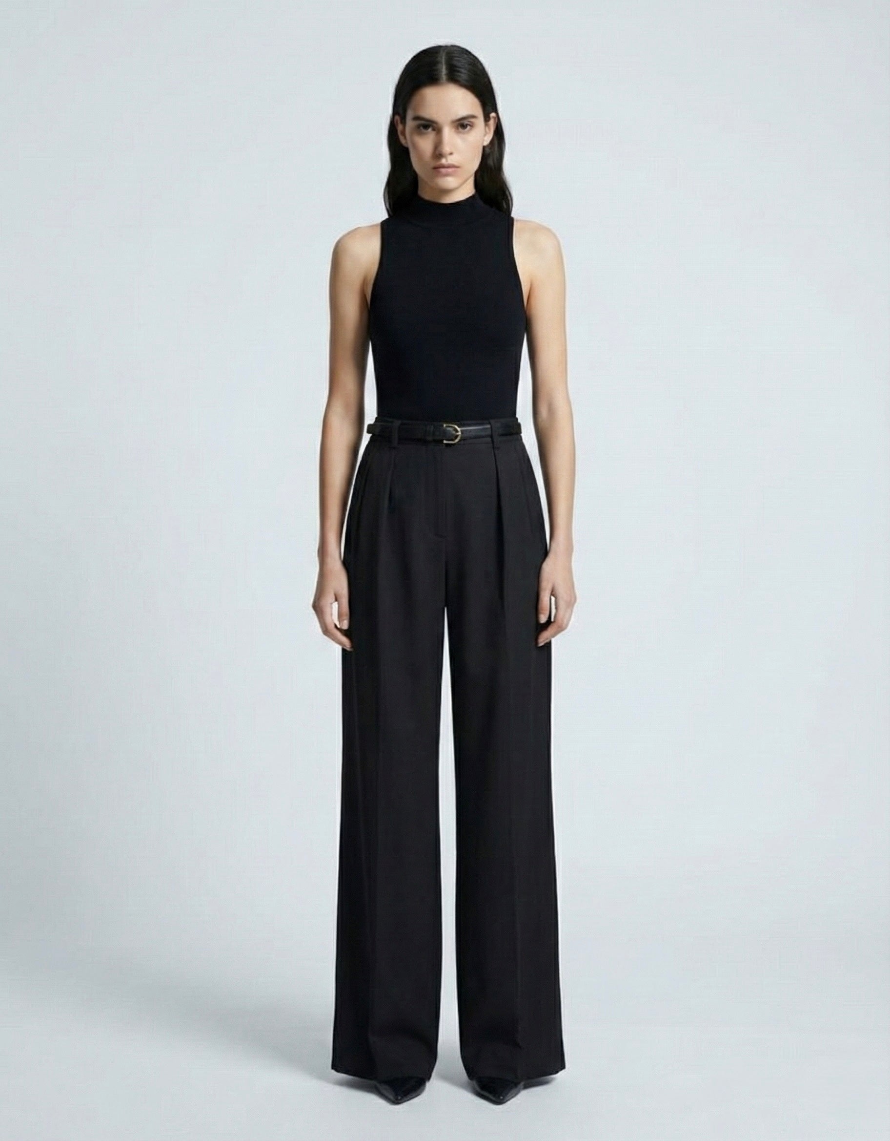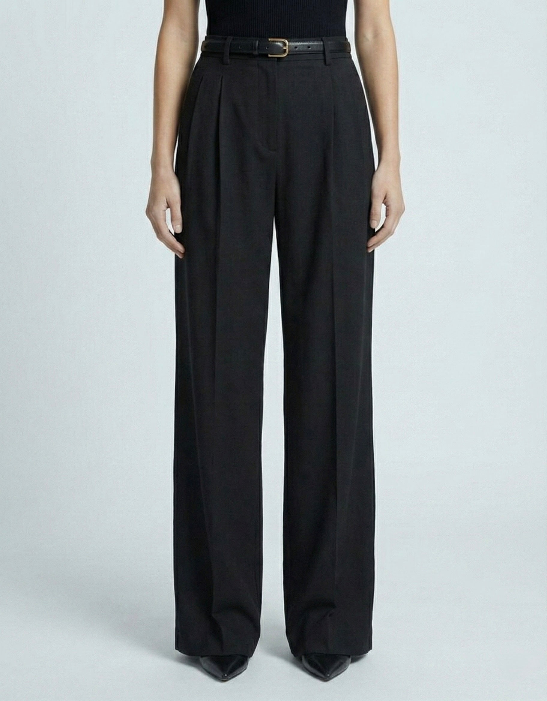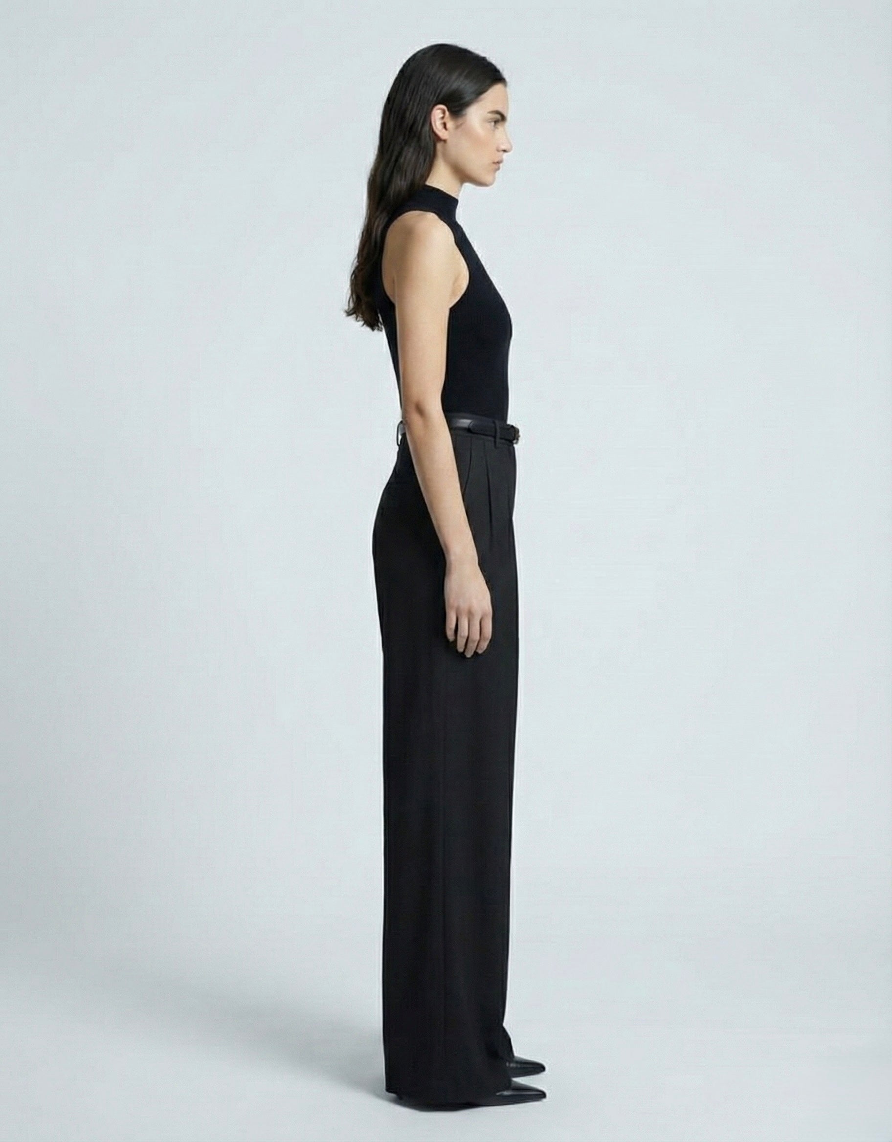 Taille haute ajustée, jambes larges longues, pinces marquées, passants structurés, fermeture frontale discrète, finitions nettes