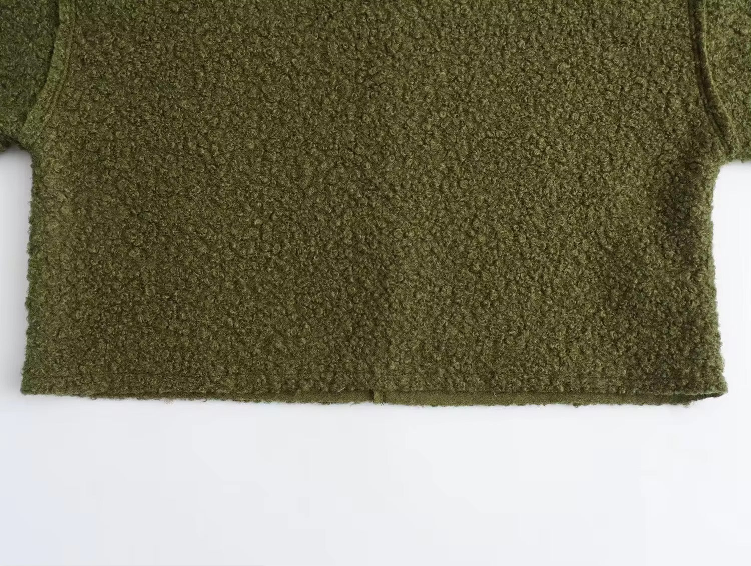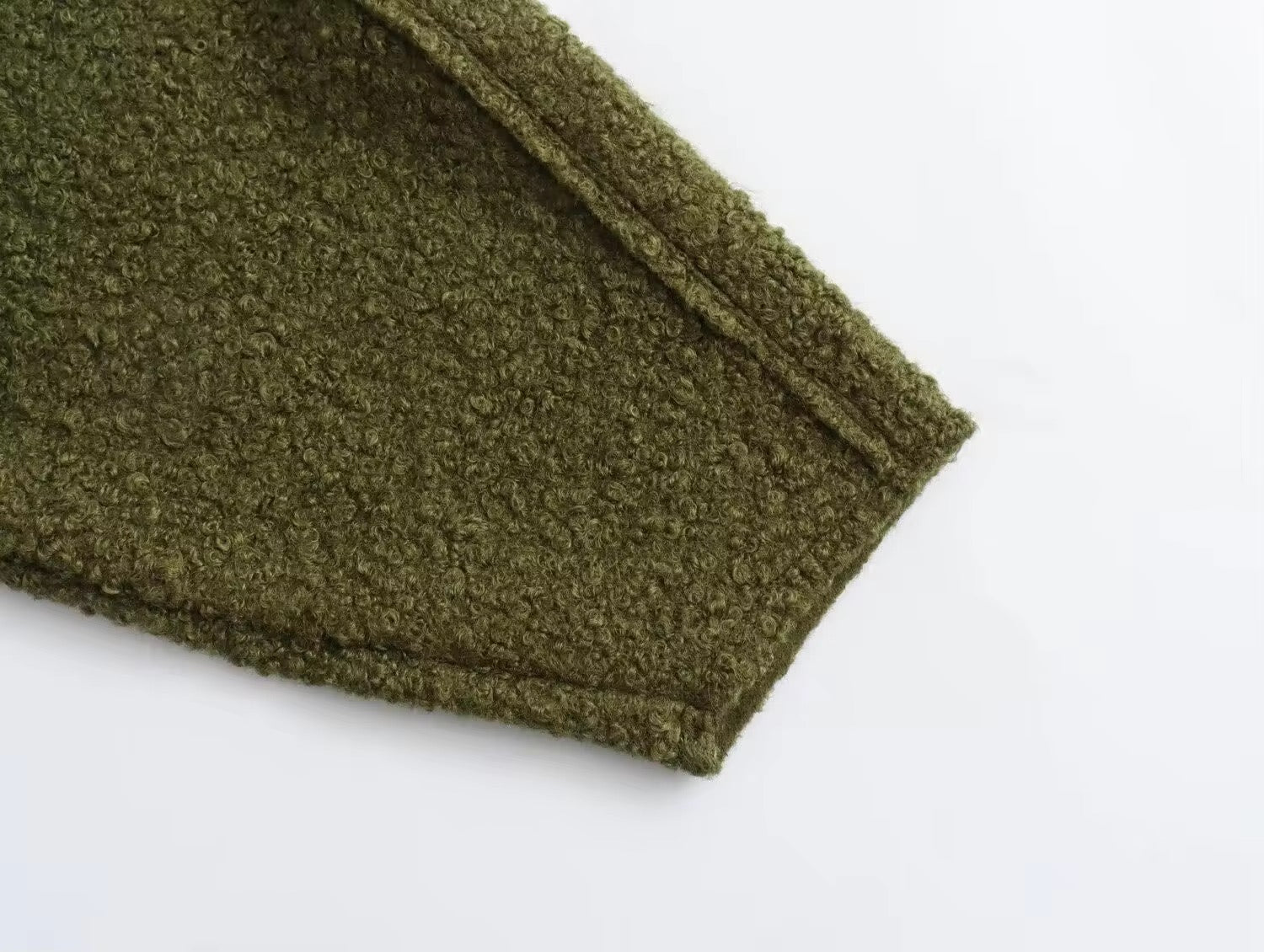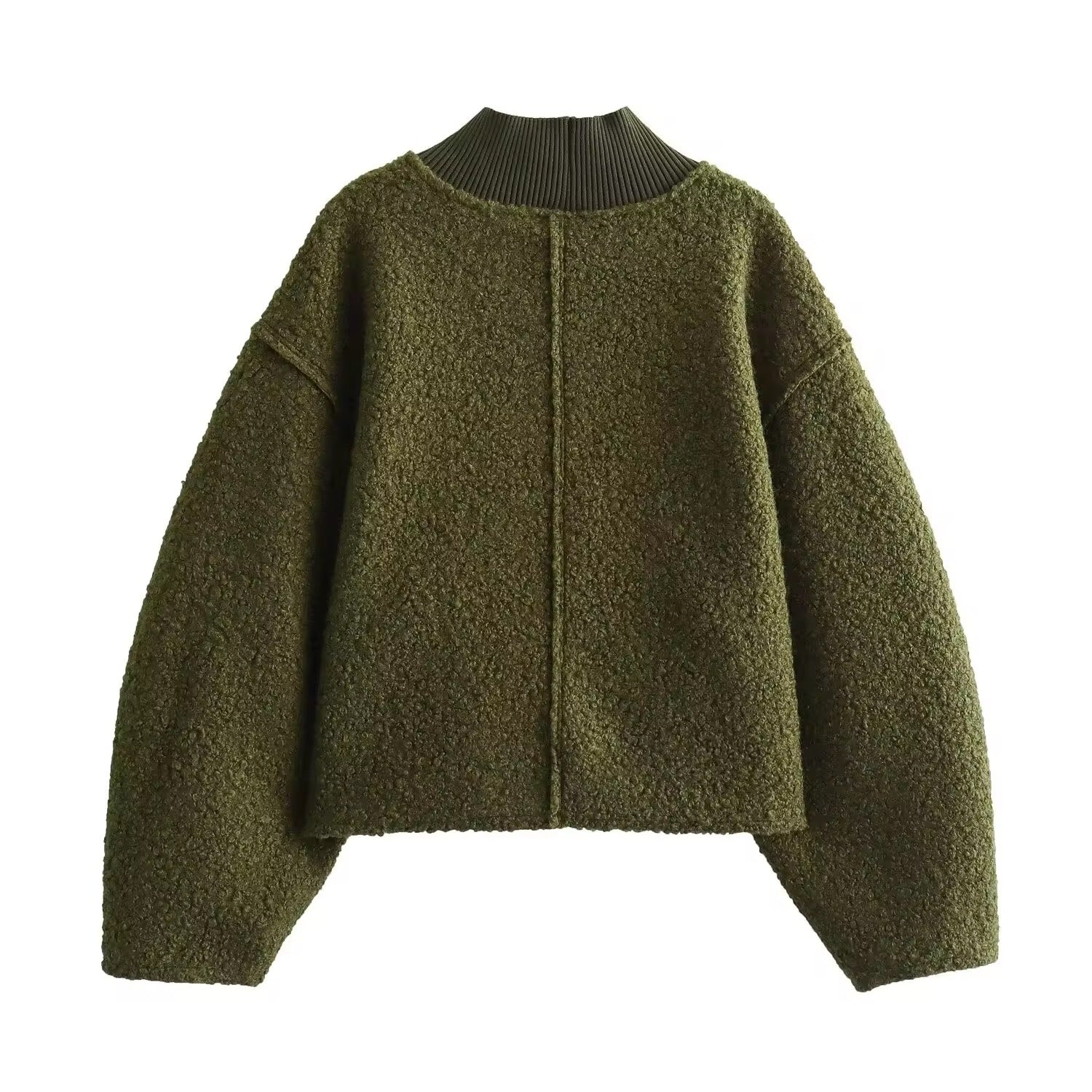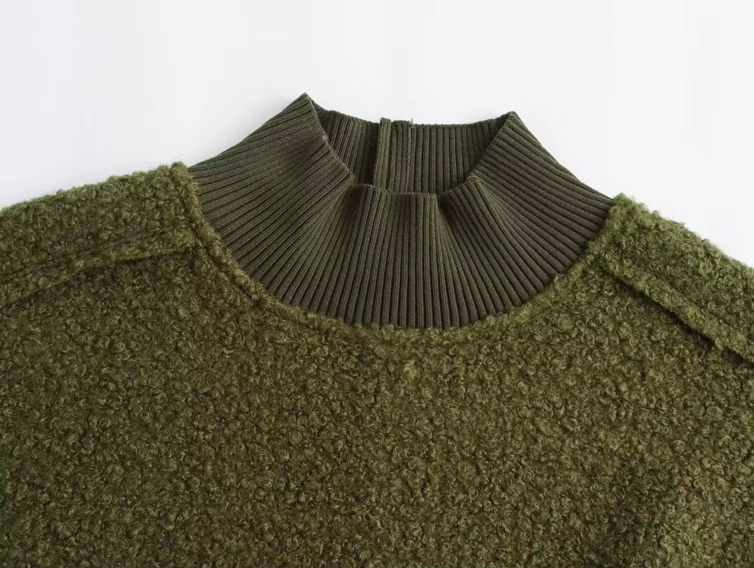 Coupe droite légèrement raccourcie. Col montant en maille côtelée contrastante avec fermeture au dos. Manches longues structurées avec coutures marquées. Tissu bouclé à effet texturé