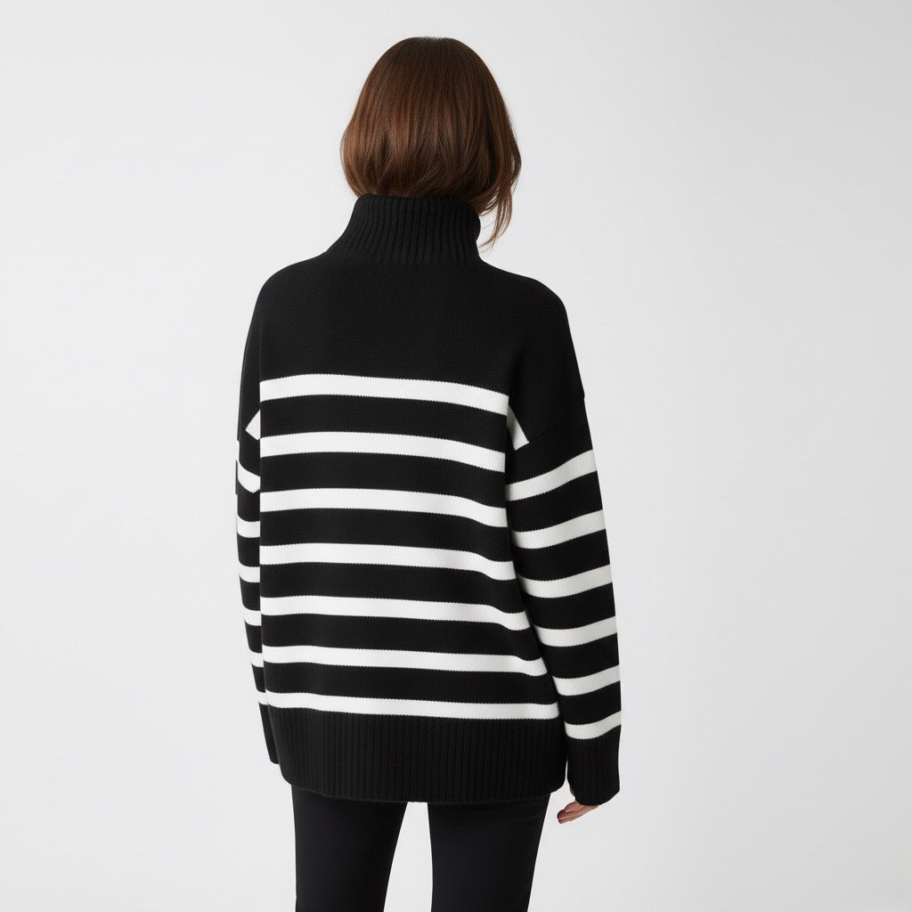 Pull à rayures horizontales, col montant côtelé, manches longues et coupe droite. Maille épaisse au toucher doux pour un maintien net.
