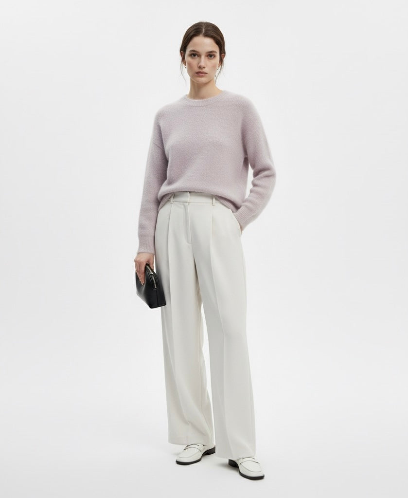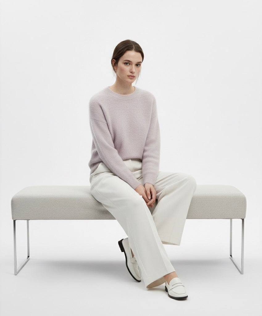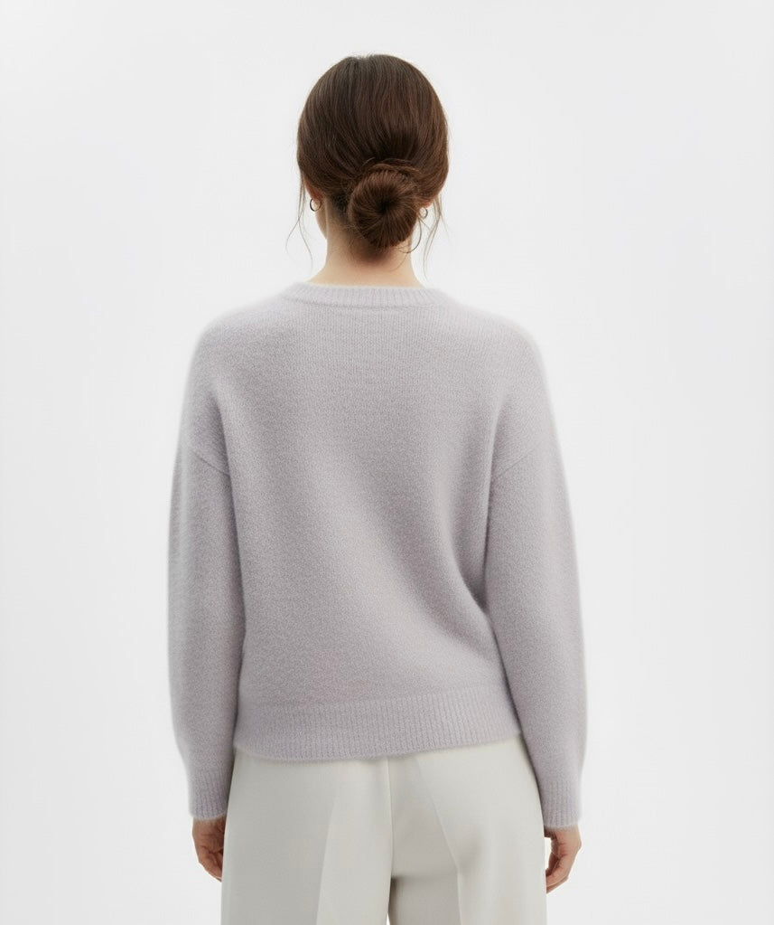 Pull en maille pelucheuse, col rond et manches longues. Coupe ample avec finitions côtelées au col, aux poignets et à la base.