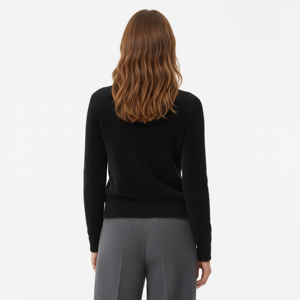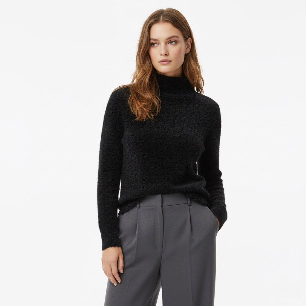Pull texturé à col roulé, coupe droite et manches longues. Épaules légèrement tombantes et finitions côtelées au col, poignets et bas.