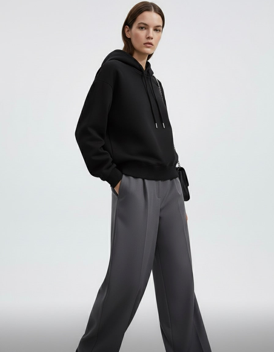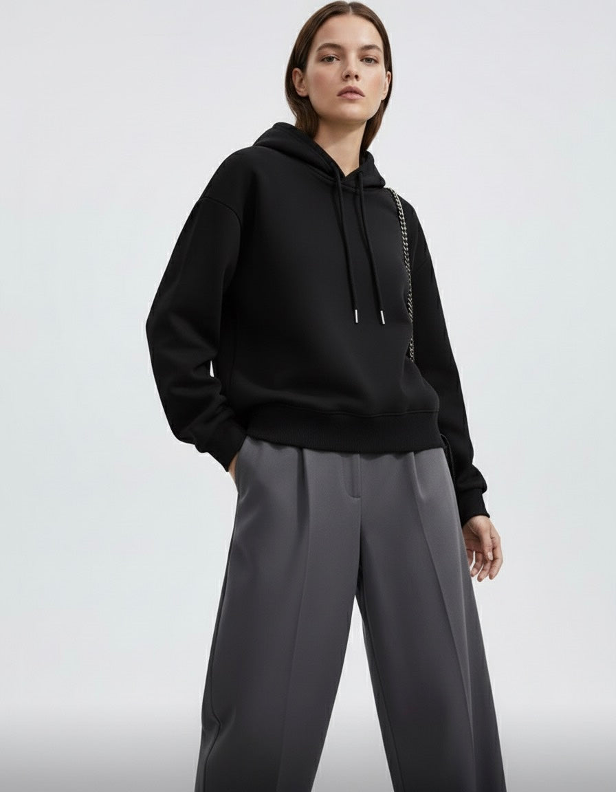 Capuche avec cordons, poche kangourou, finitions bord-côte, manches longues, volume droit, texture molleton épaisse, silhouette polyvalente