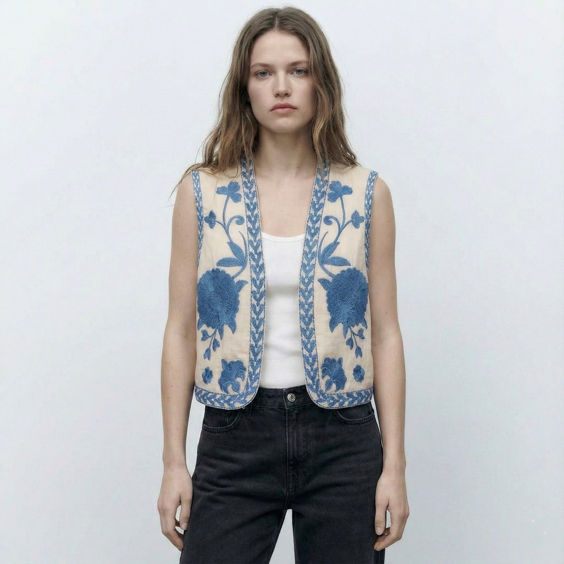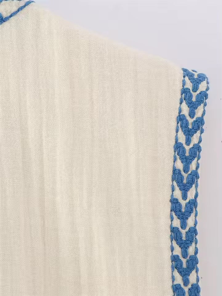 Coupe droite ouverte sur l’avant. Tissu léger orné de broderies florales contrastantes. Bordures décoratives en galon tissé. Finitions nettes aux emmanchures et à la base