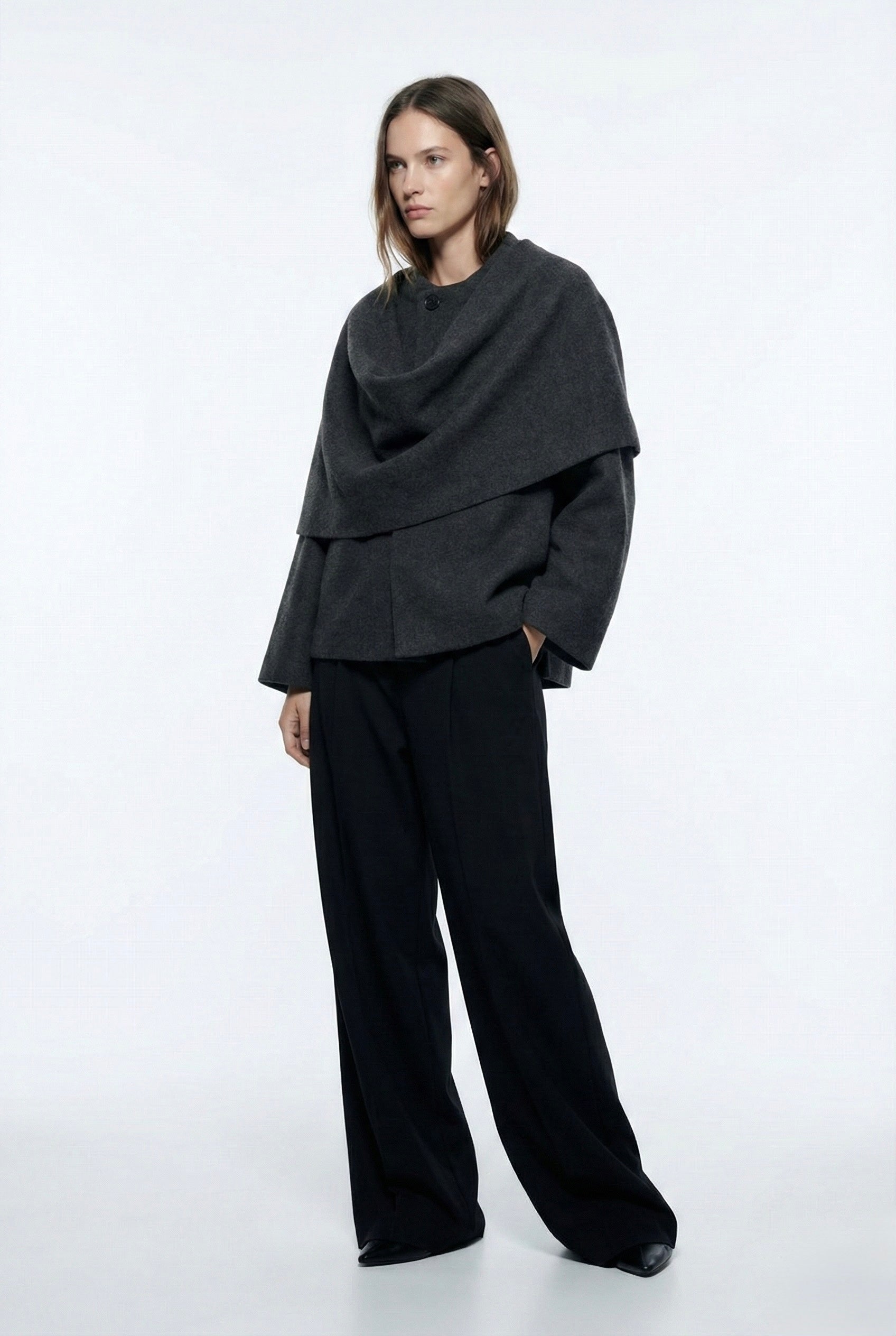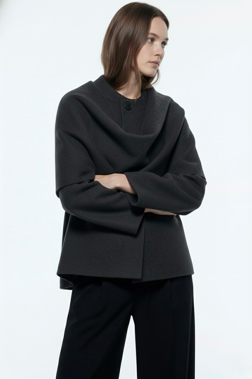 Manteau mi-long avec encolure asymétrique formée par un drapé effet écharpe intégré. Manches longues, coupe droite avec finition brute. Fermeture croisée invisible à l’avant.