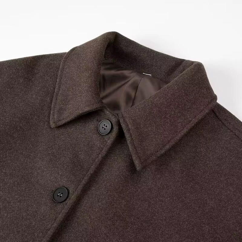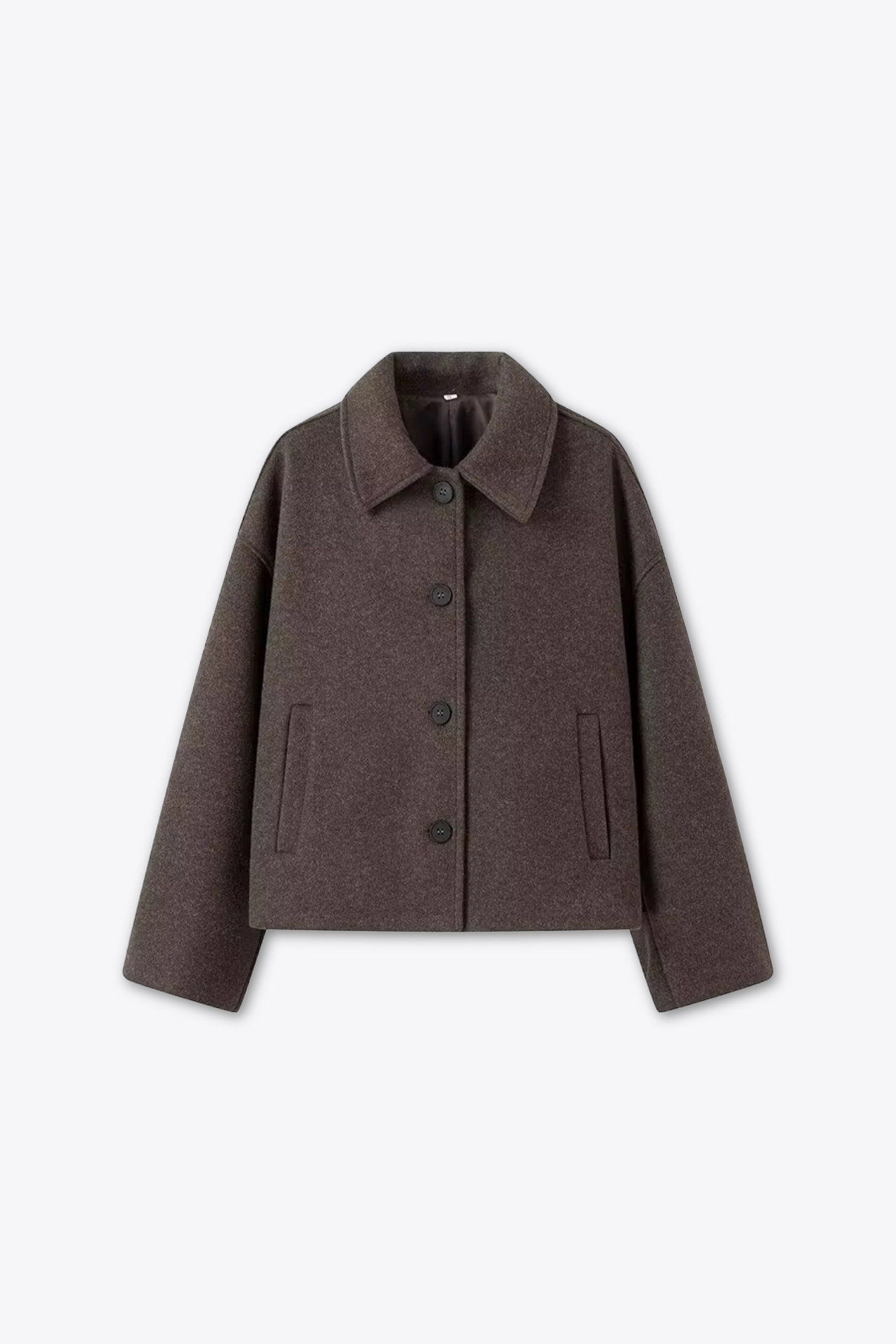 Veste droite à col classique, fermeture à boutons et poches passepoilées. Coupe minimaliste et ligne épurée