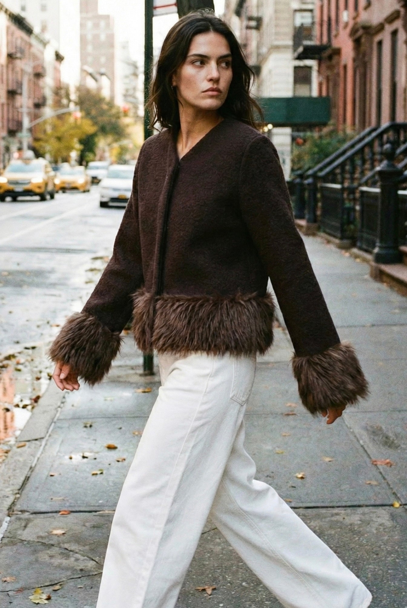 VESTE COURTE À FINITIONS EFFET FOURRURE