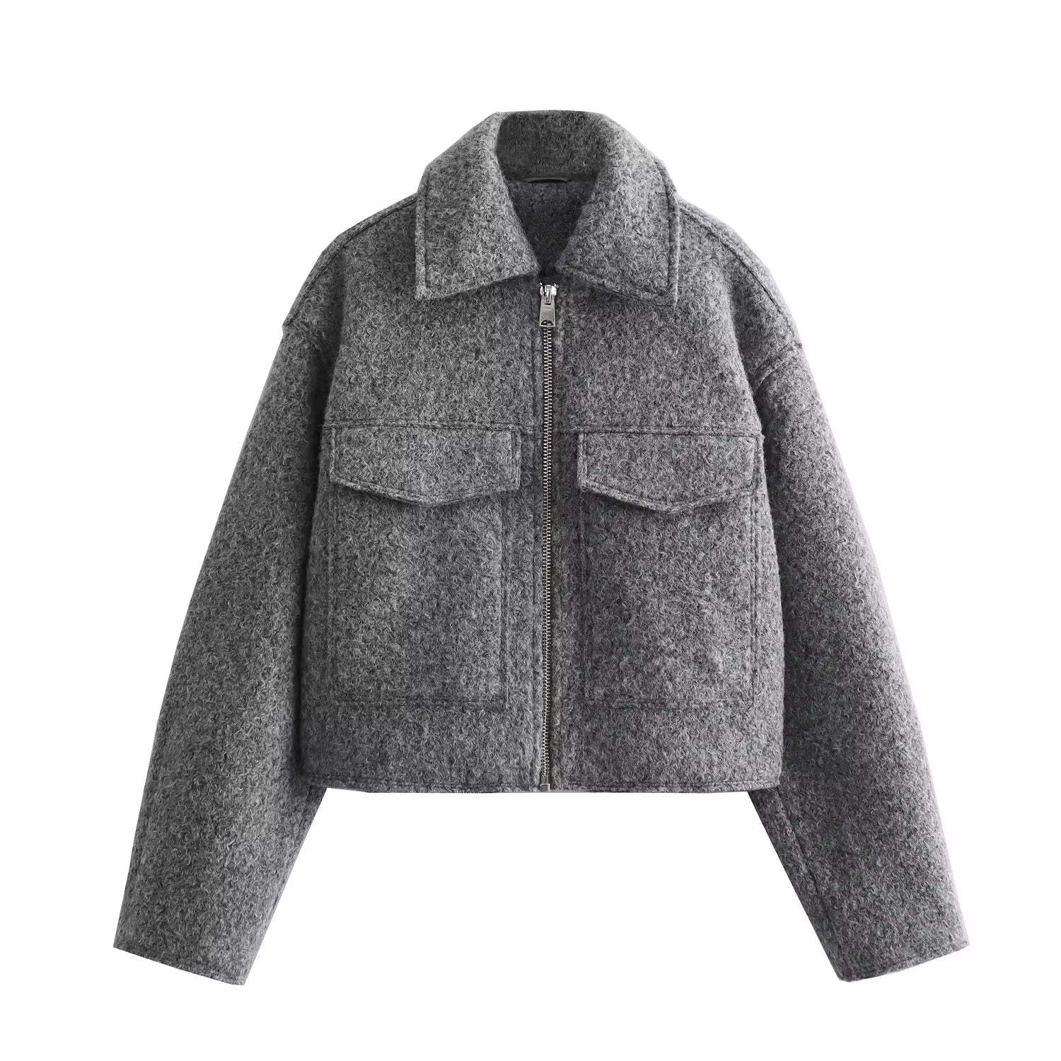 Veste droite à col classique, fermeture éclair et poches à rabat. Épaules tombantes et coupe ample.