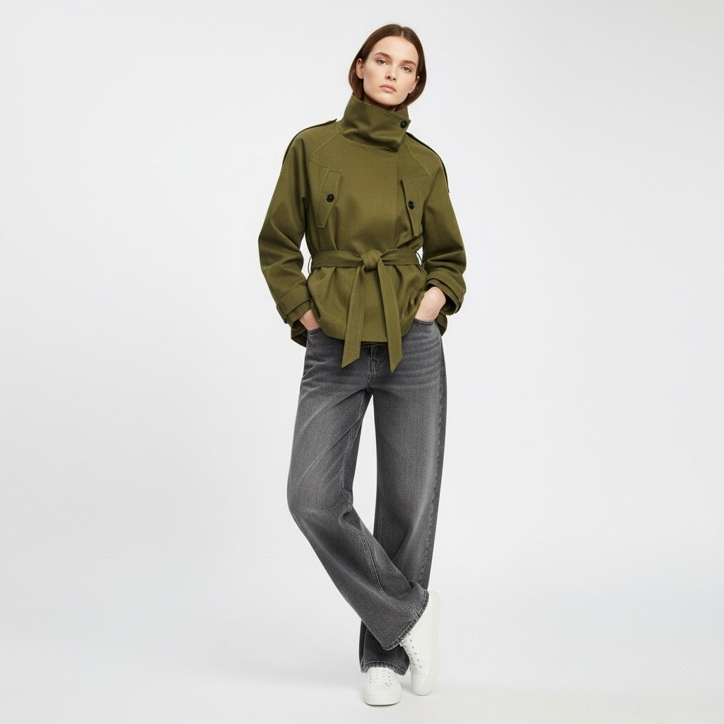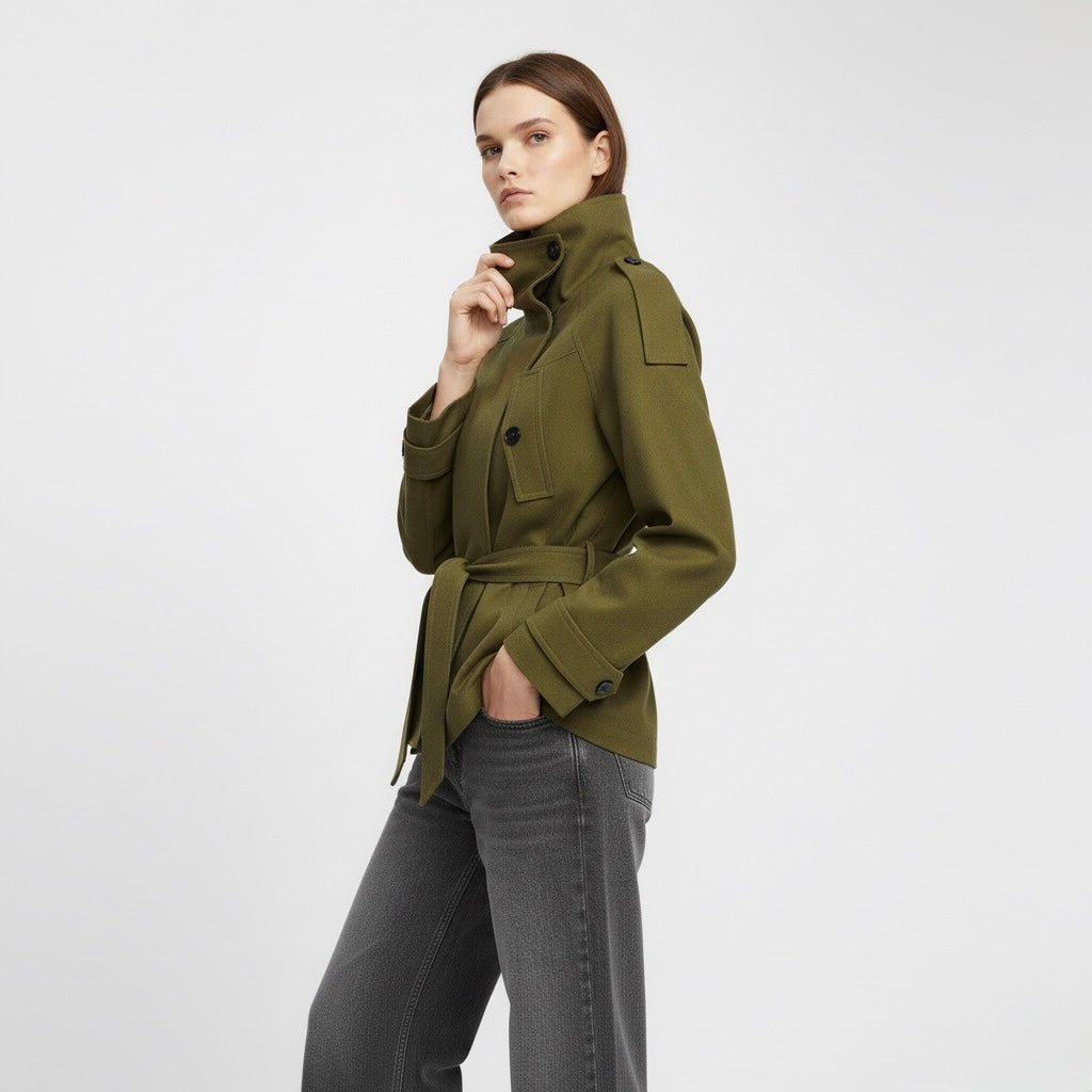 Veste droite à col montant boutonné, poches à rabat avec boutons contrastés, ceinture assortie à nouer, manches longues avec pattes ajustables. Épaules marquées avec détails d’épaulettes